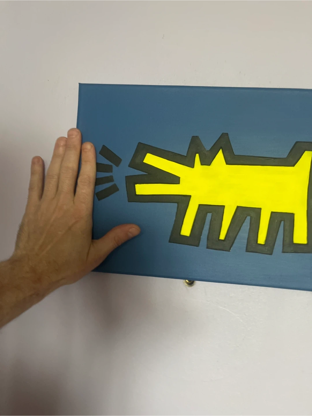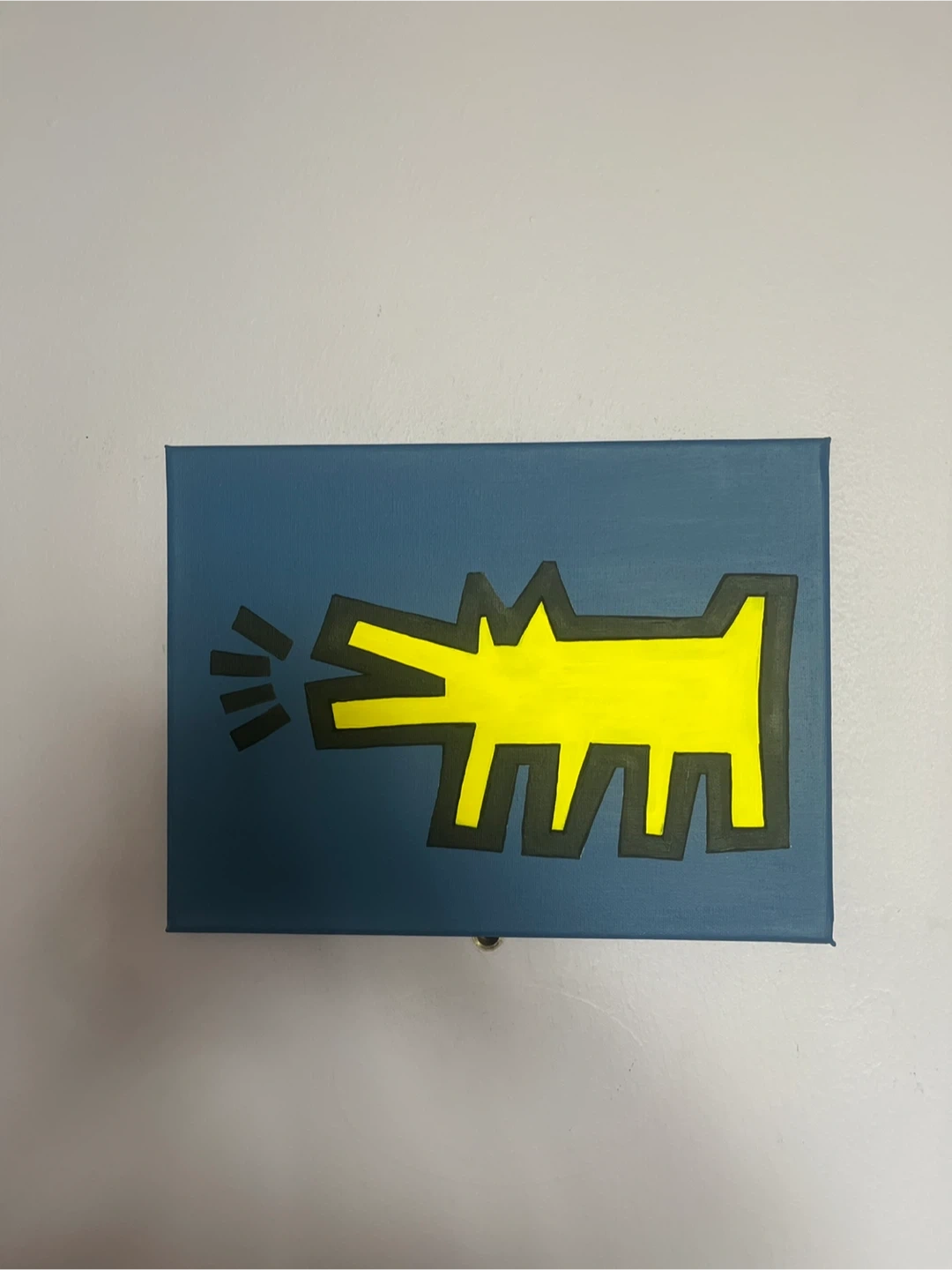 Bootleg. Painted by me. This canvas features a vibrant yellow barking dog graphic on a blue background. It's a statement piece for any wall! The artwork measures 12" x 8" and is printed on stretched canvas.