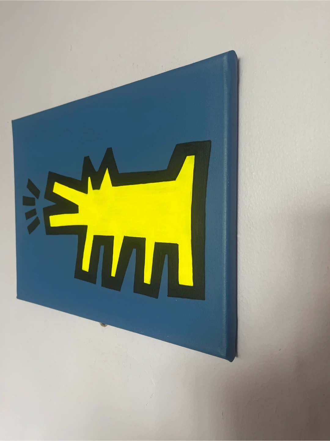 Bootleg. Painted by me. This canvas features a vibrant yellow barking dog graphic on a blue background. It's a statement piece for any wall! The artwork measures 12" x 8" and is printed on stretched canvas.