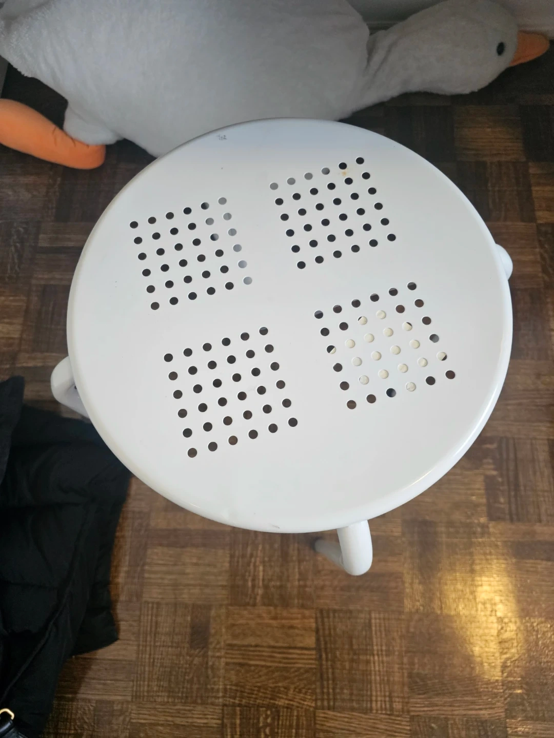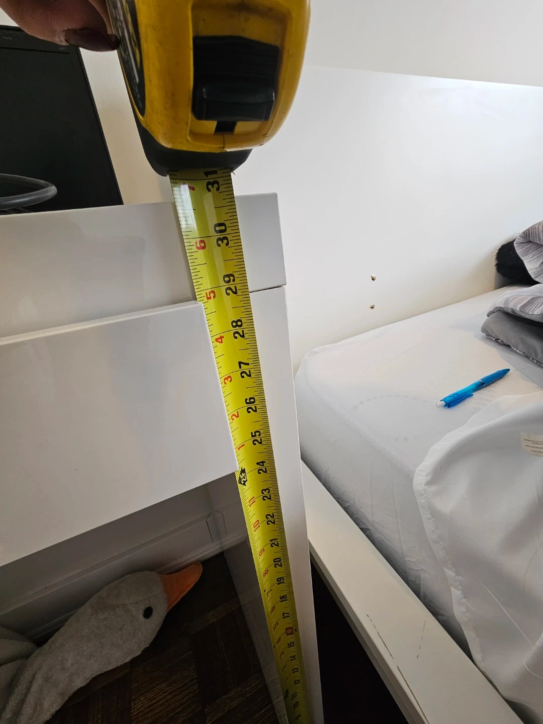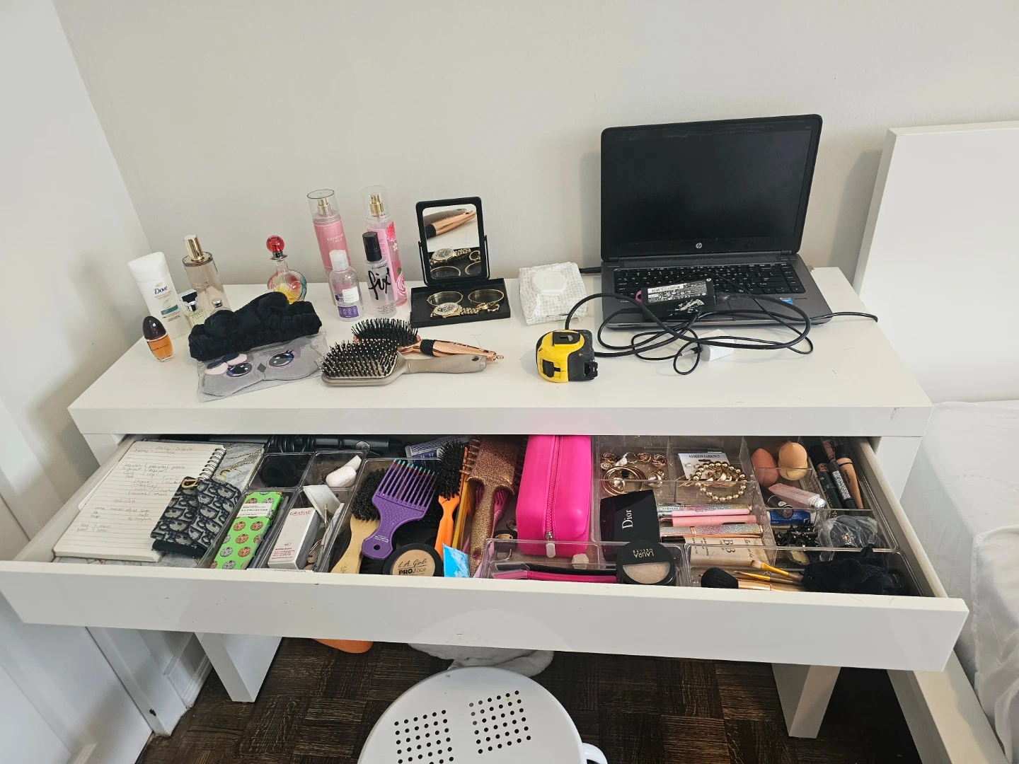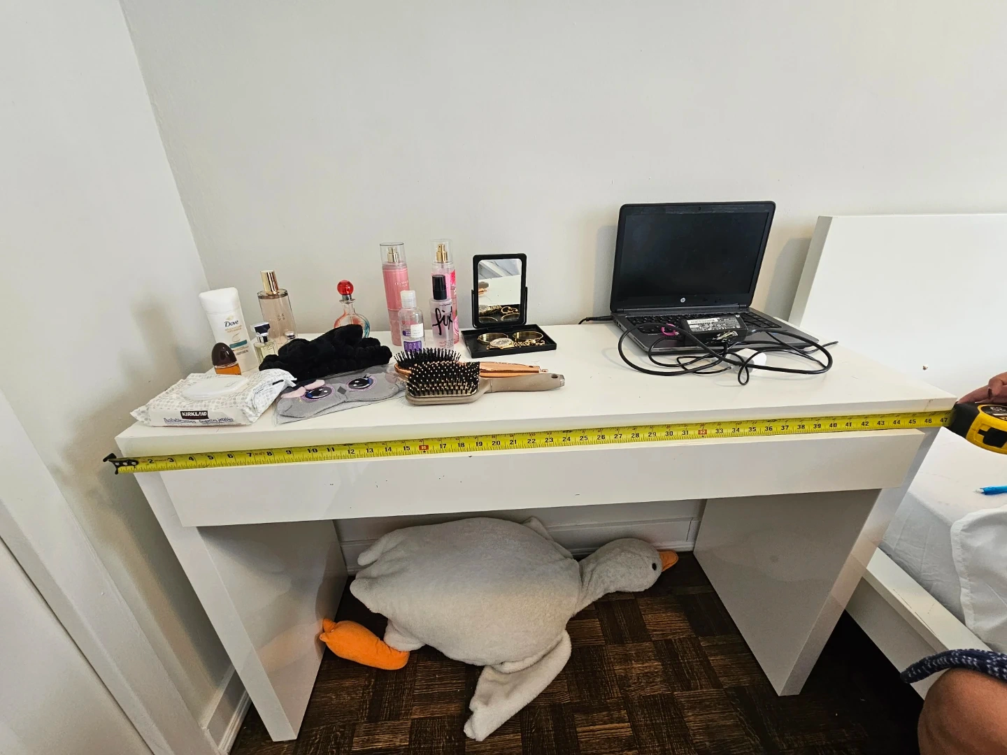 A clean white modern desk. It's roughly 47 inches long, 20 inches deep, and 30 inches high. It has a single drawer for storage. Great for a bedroom or home office!