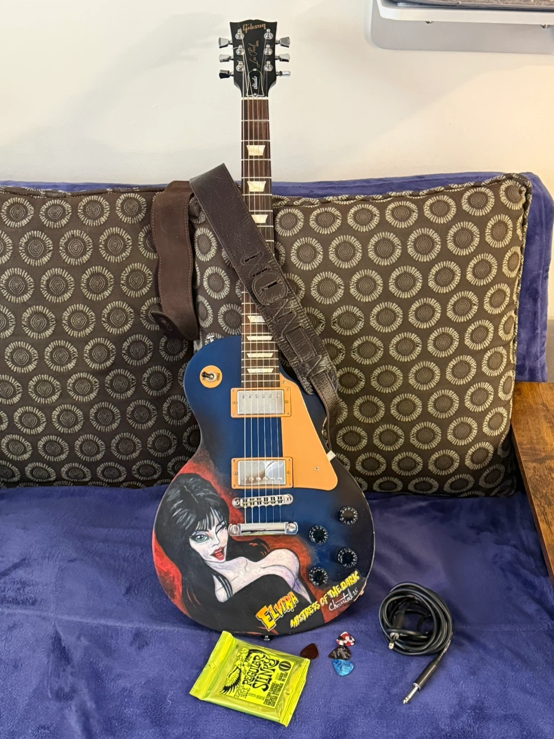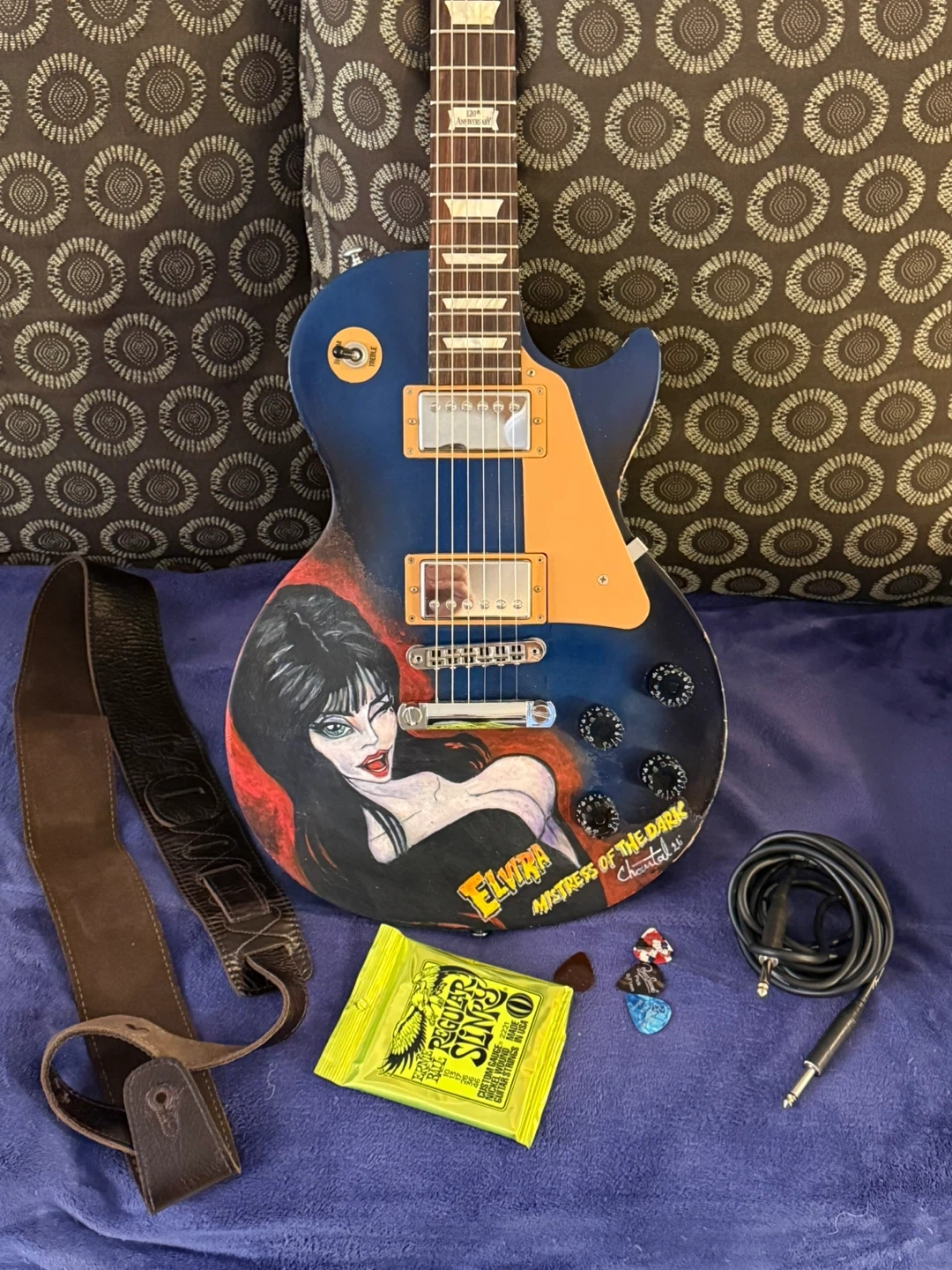 This is a Gibson Les Paul Studio electric guitar, celebrating the 120th anniversary. It features a custom Elvira "Mistress of the Dark" artwork on the body. Comes with a strap, cable, and picks.