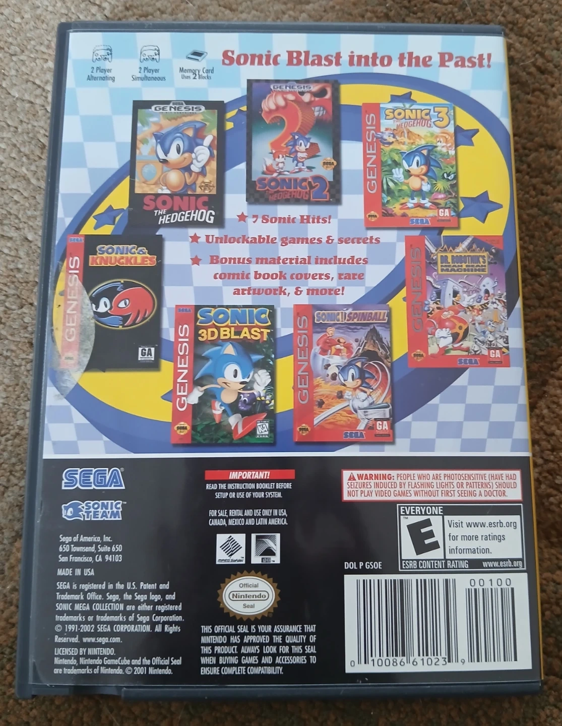 Sonic Mega Collection for Nintendo GameCube includes 7 great Sonic games. It features unlockable games, secrets, comic book covers, rare artwork, and more! This compilation is a must-have for any Sonic fan.