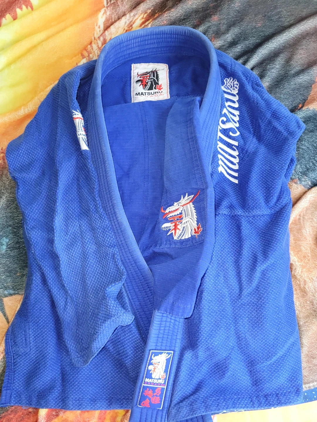 This is a blue jujitsu gi from Matsuru. It's a martial arts uniform. The fabric is durable and designed for training and competition. I can include a white belt, it's in great condition. Size C3 for children. It's always good to have an extra gi since you need to wash them often, always air dry. New sale for $100+
