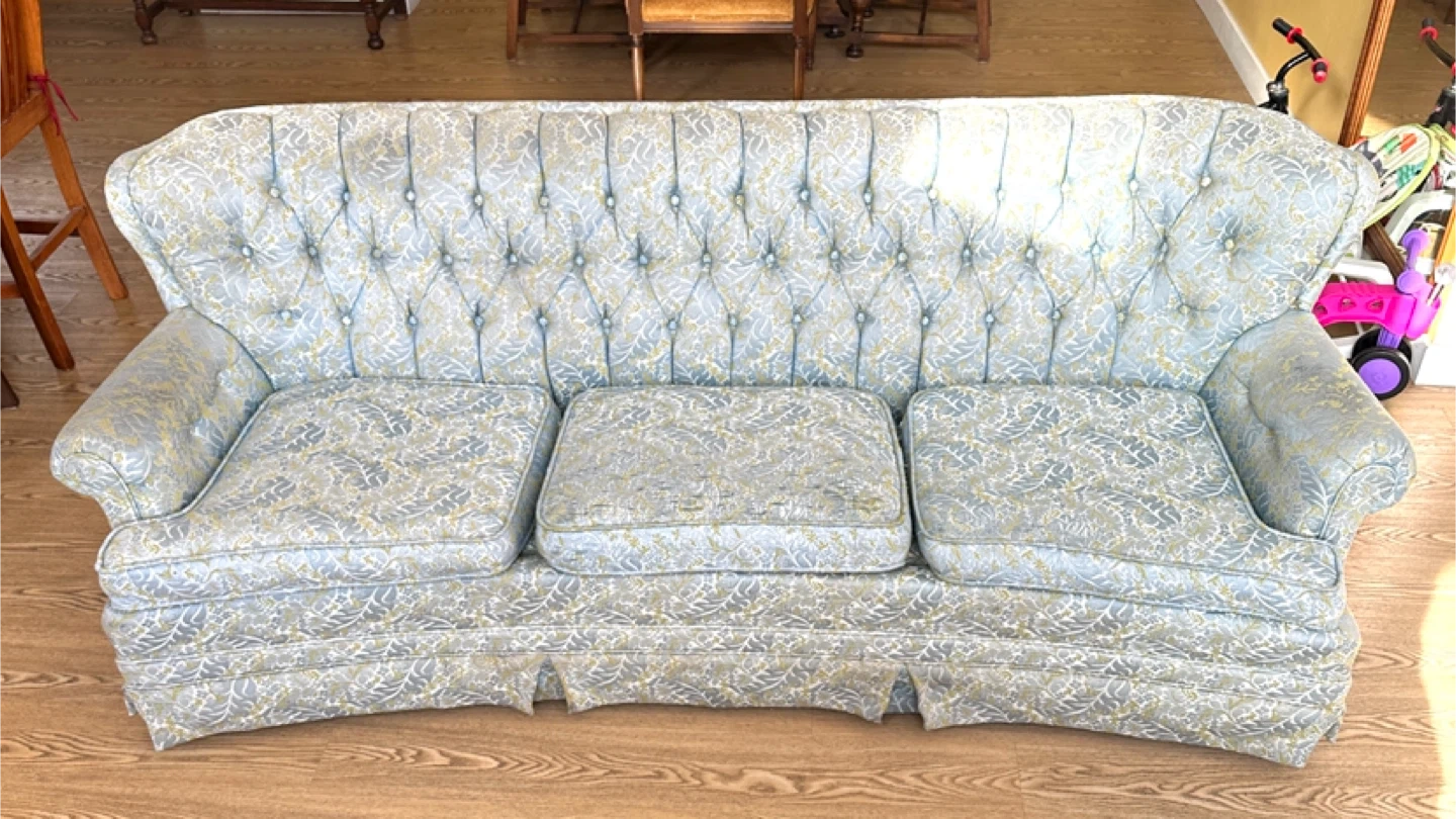 Beautiful vintage traditional sofa featuring a deep button-tufted back, rolled arms, and classic skirted base. Well-made with a sturdy frame and plush seating—perfect for a formal living room, cottage, or traditional décor.