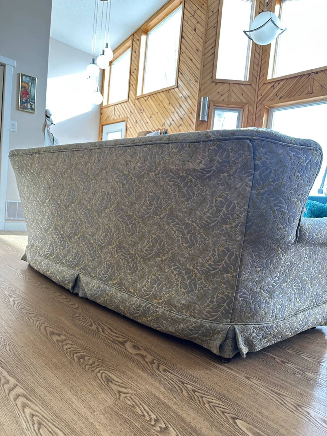 • Floral jacquard upholstery (blue & gold tones)