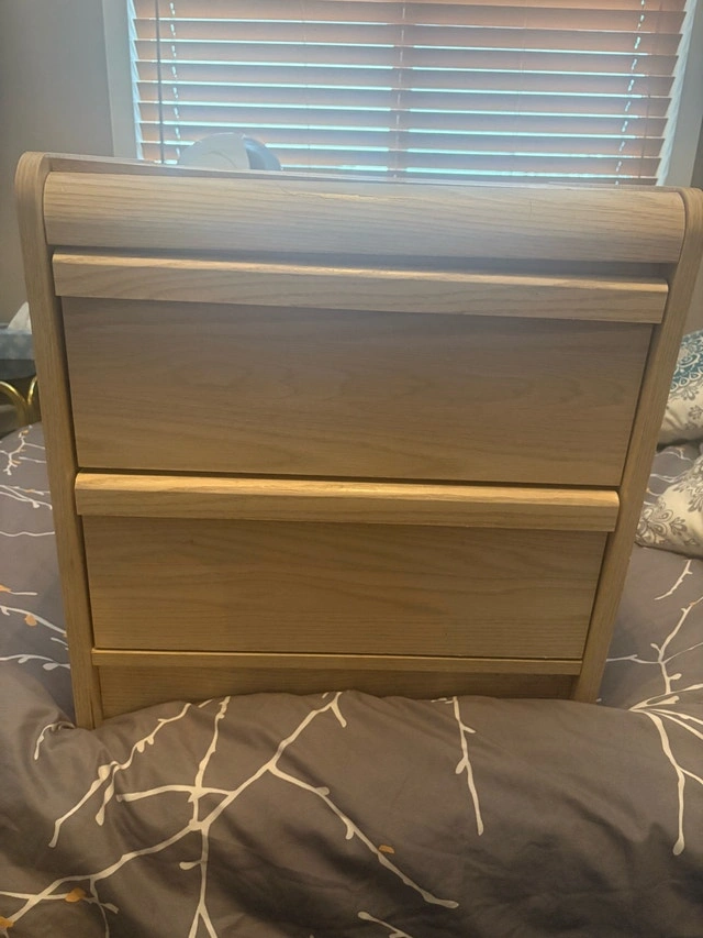 Sturdy, great bedside table with drawers. Small warp in wood shown on last photo, easy to fix. 21 1/2 inches tall, 16 inches wide, 20 3/4 inches long. Pick up in Kernohan.