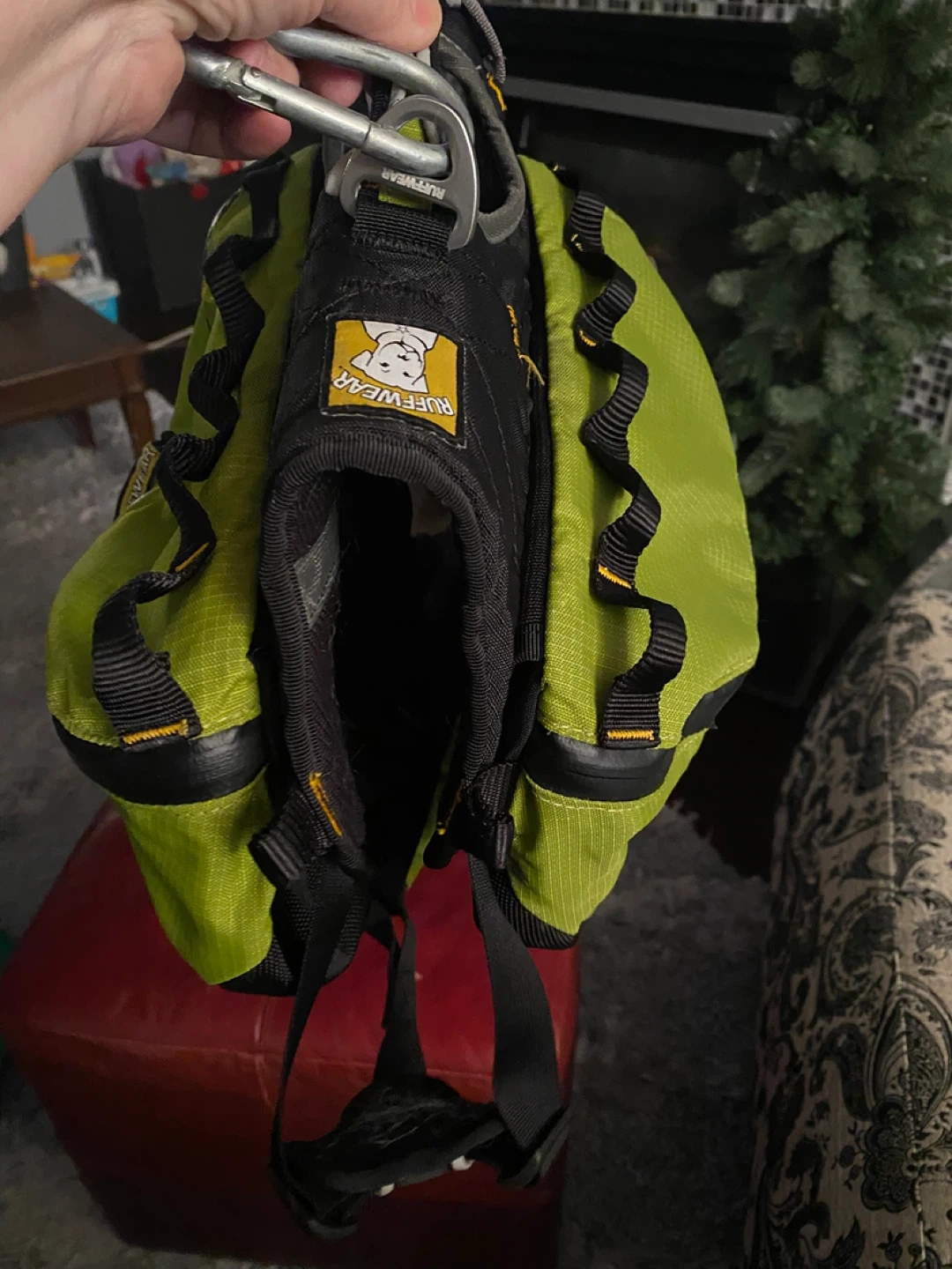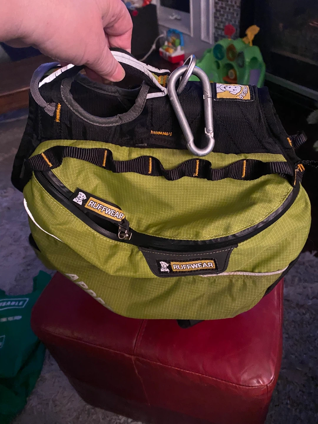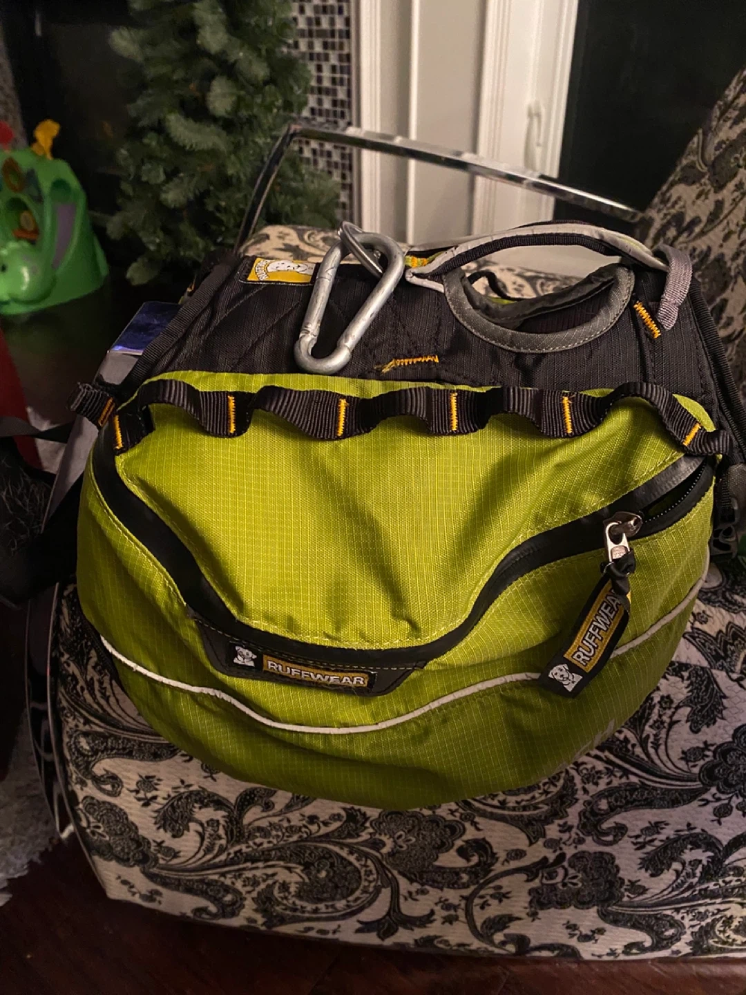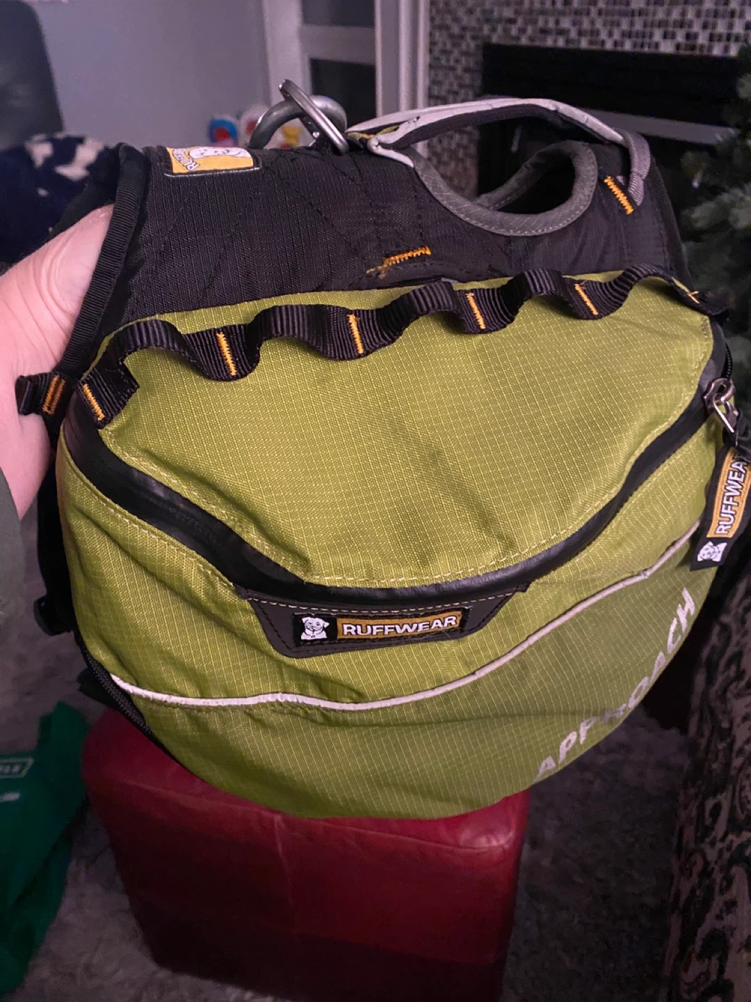This is a Ruffwear Approach Dog Backpack in lime green. It's designed for day hiking and overnight trips with your canine companion. Features multiple pockets and adjustable straps for a comfortable fit.