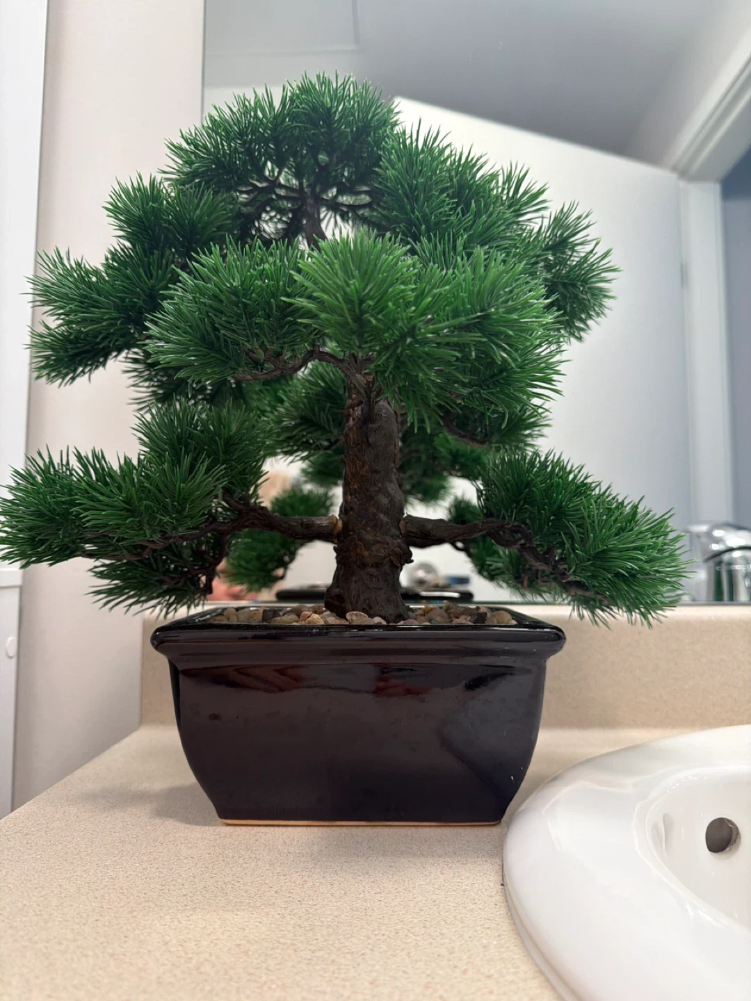 A lovely artificial bonsai tree sits in a shiny black pot. It's adorned with small stones around the base of the trunk. This little tree adds a touch of green without any upkeep!