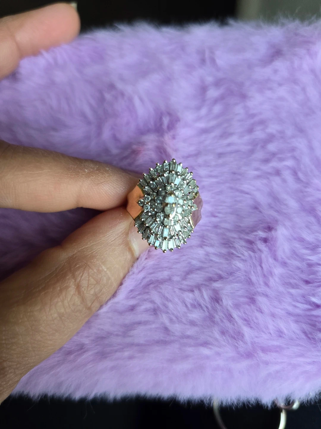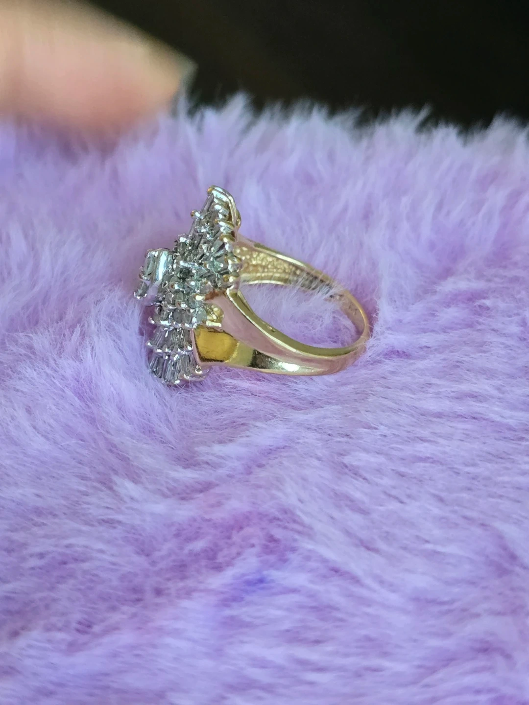 Sparkling diamond cluster ring with a unique design. Features a mix of baguette and round-cut diamonds set in gold-tone metal. It's a statement piece!