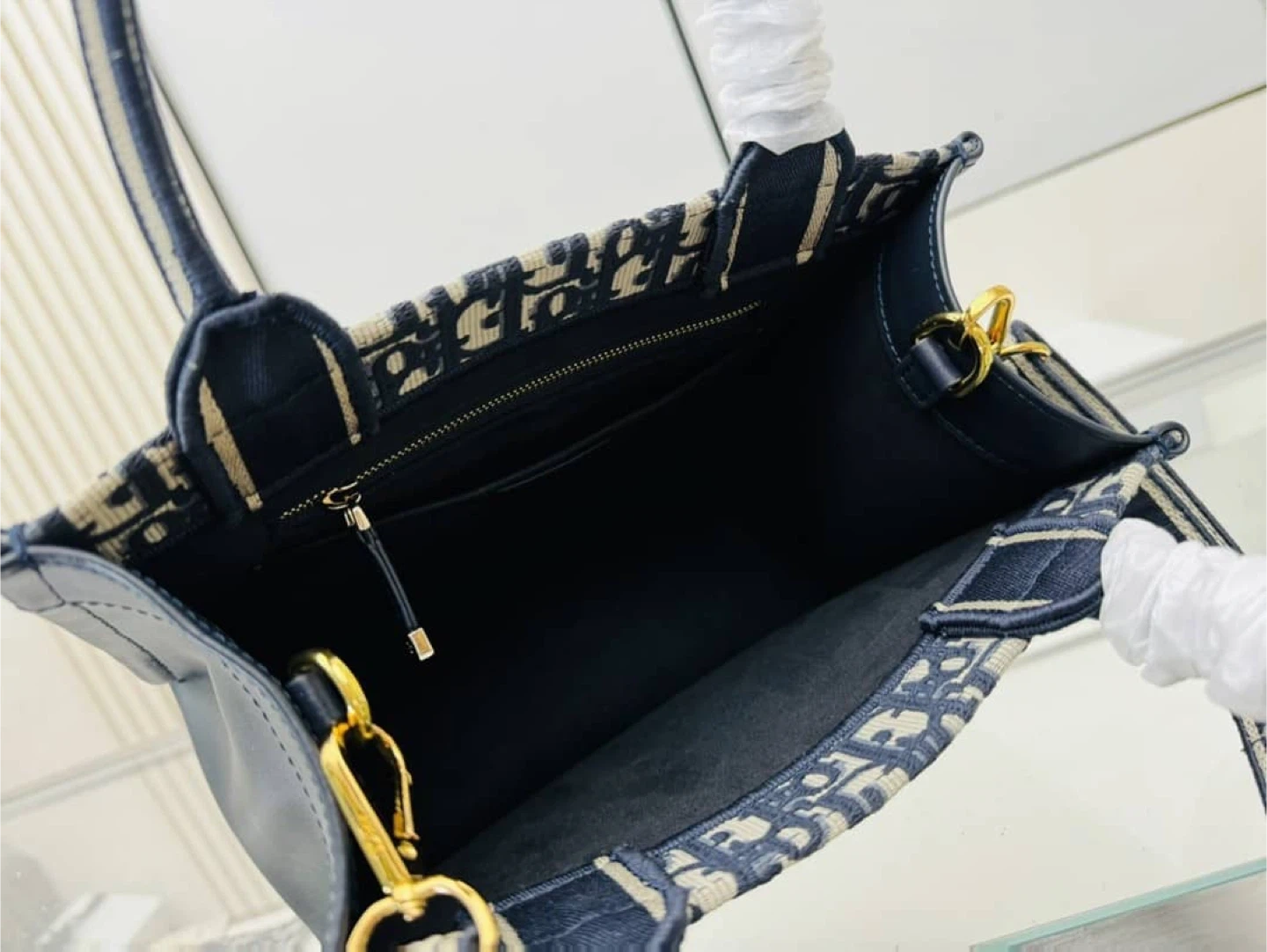 Christian Dior book tote bag in navy blue with signature Dior Oblique canvas. Features top handles and a removable shoulder strap. This stylish bag is great for everyday use!