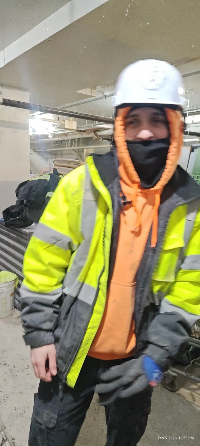 This is a high-visibility work jacket with reflective stripes. It has an orange hoodie underneath. Also includes work pants and gloves.
