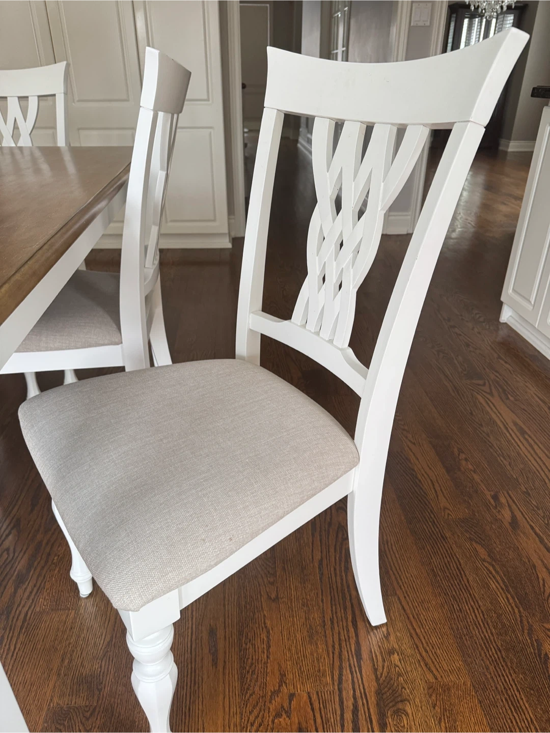 This set includes a rectangular dining table with a wood-look top and white base, along with six matching white chairs featuring upholstered seats. The chairs have a decorative woven back design and turned legs. It's a classic set perfect for family dinners or entertaining guests.