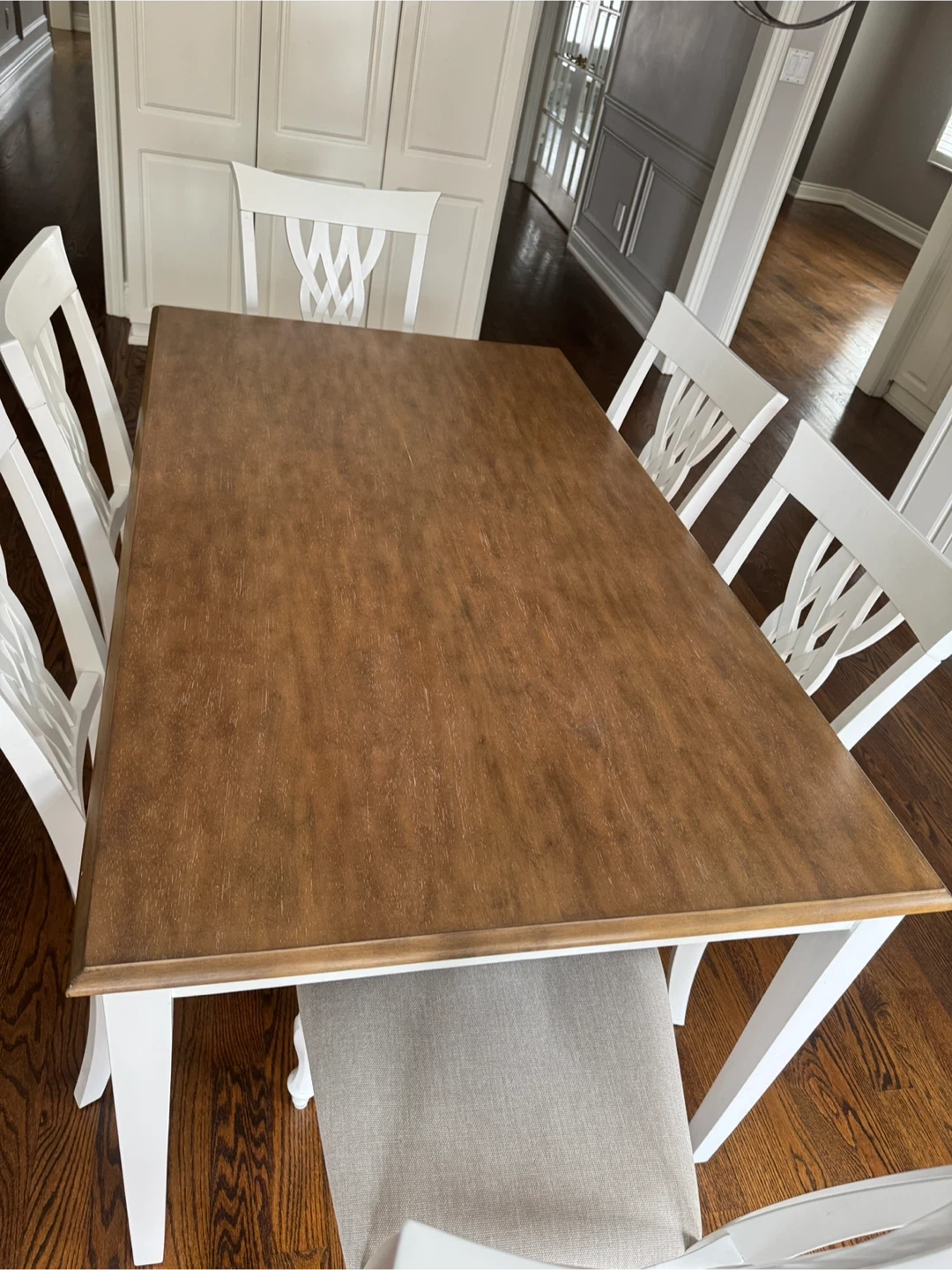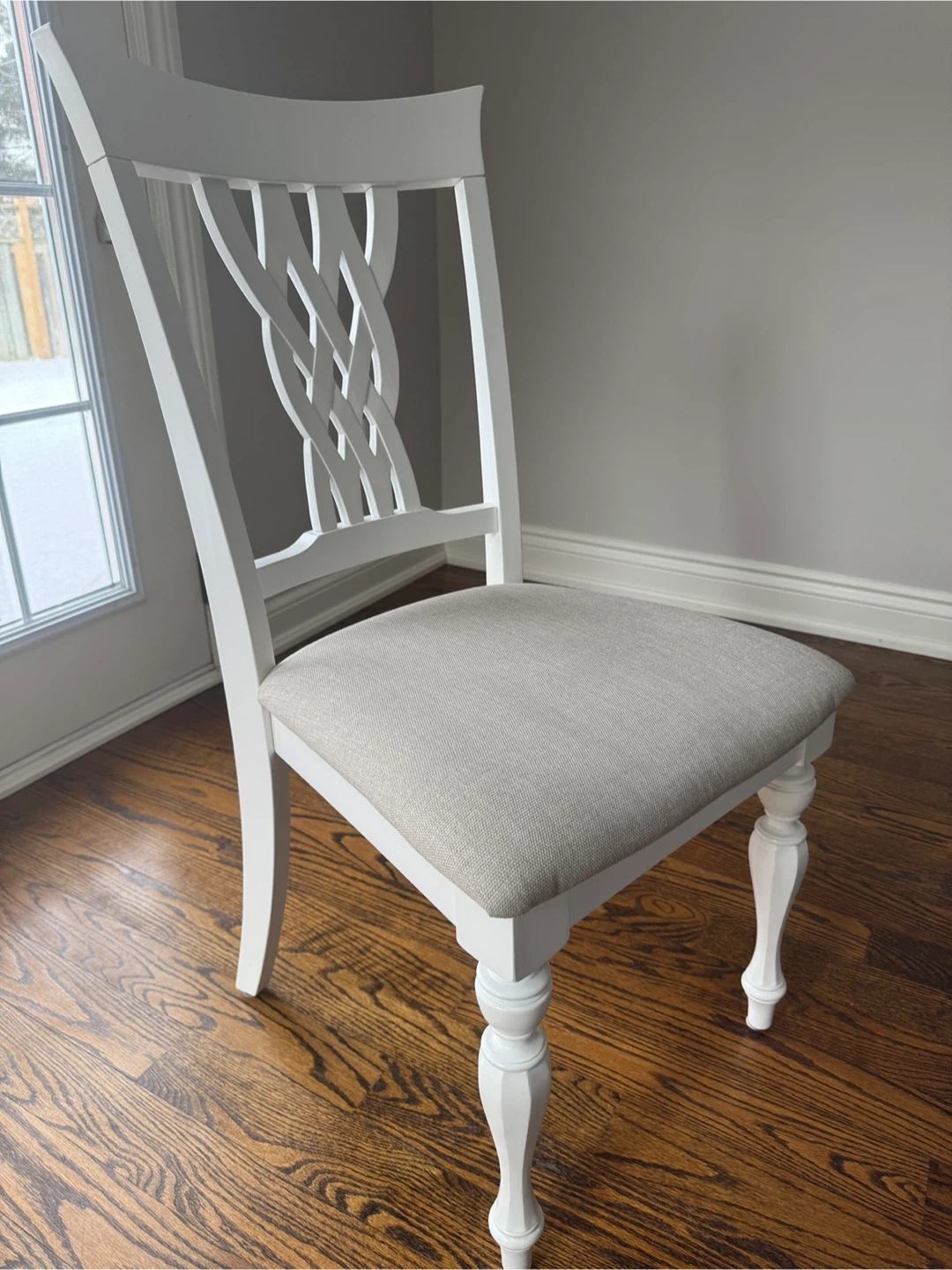 This set includes a rectangular dining table with a wood-look top and white base, along with six matching white chairs featuring upholstered seats. The chairs have a decorative woven back design and turned legs. It's a classic set perfect for family dinners or entertaining guests.