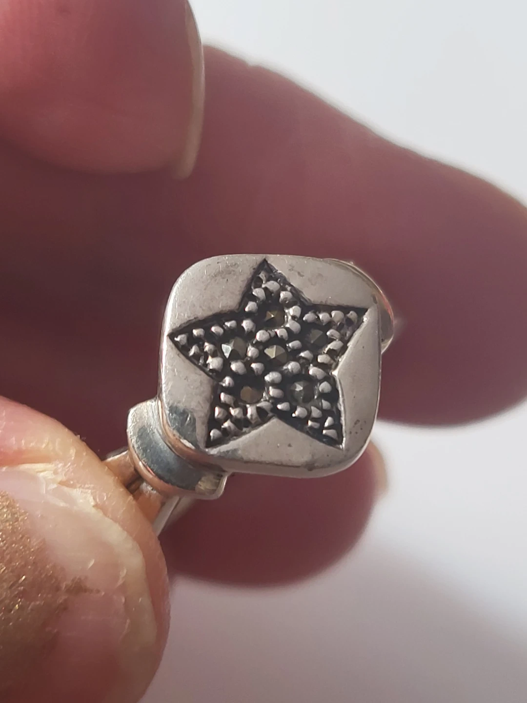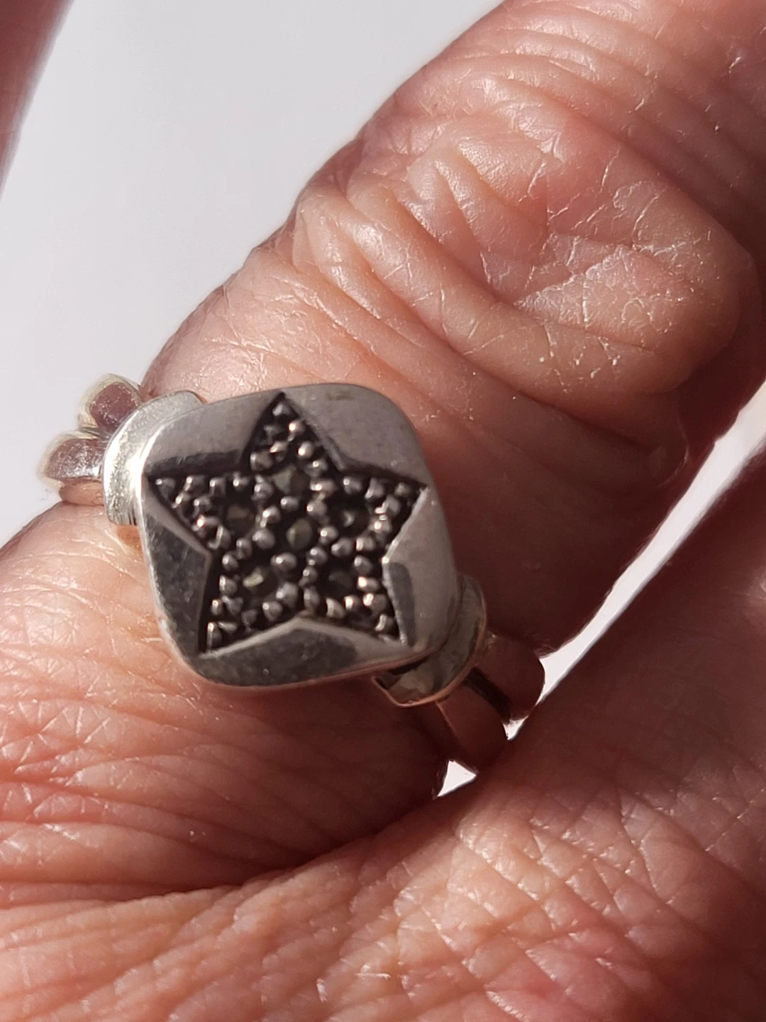 This is a silver ring featuring a star design and Marcasite Stones. It's marked with "925" indicating sterling silver. The band has a simple, classic shape.