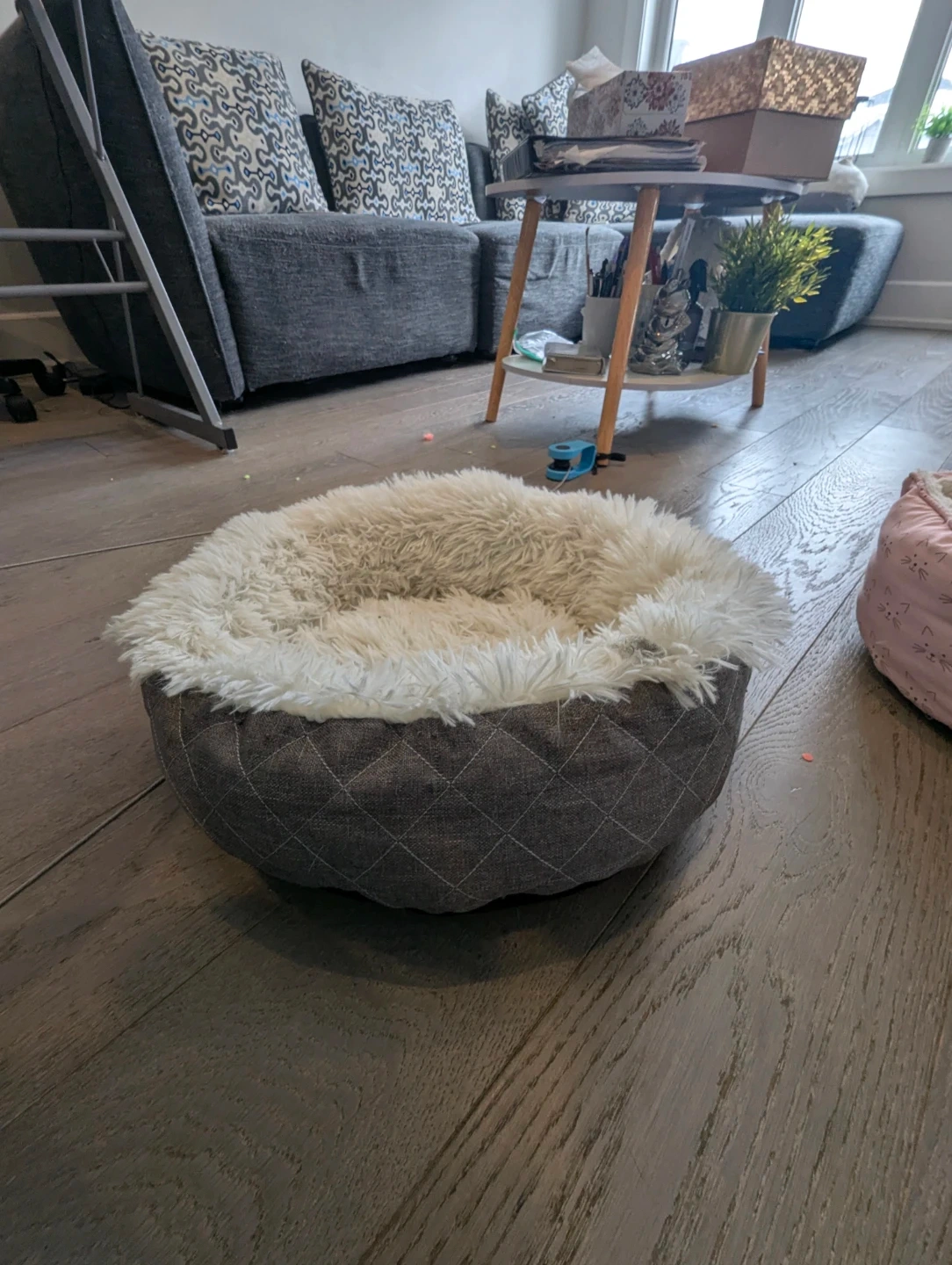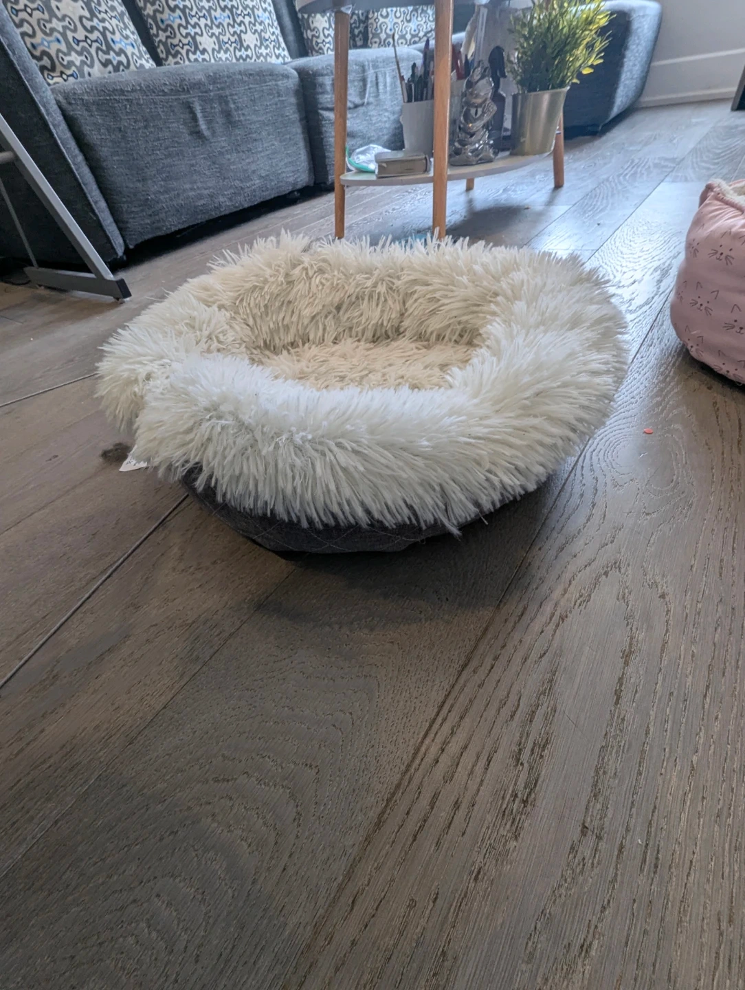 Super soft, round pet bed with a fluffy white interior and a quilted grey exterior. It's designed for comfort. Perfect for small dogs or cats to curl up in!