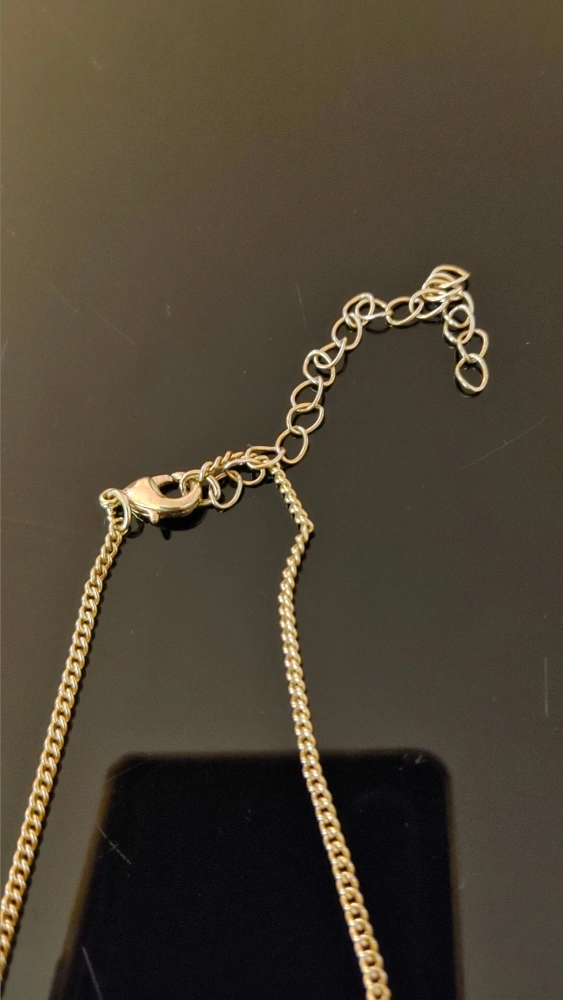 This is a gold-tone chain necklace. It features a lobster clasp and an adjustable extender chain. The chain's link style is curb. It's a versatile piece that can be worn on its own or with a pendant.
