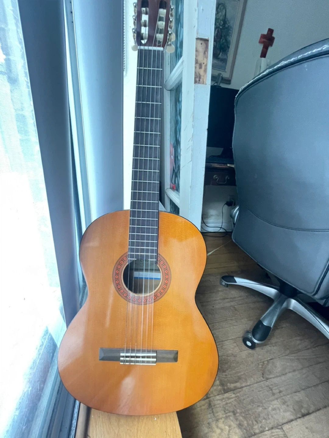 This is a Yamaha C-40 classical guitar. It's a full-size instrument with nylon strings. Perfect for beginners or those looking for a comfortable acoustic sound. Firm price.