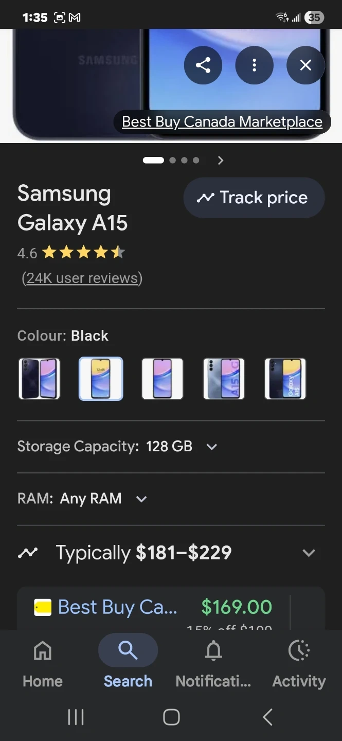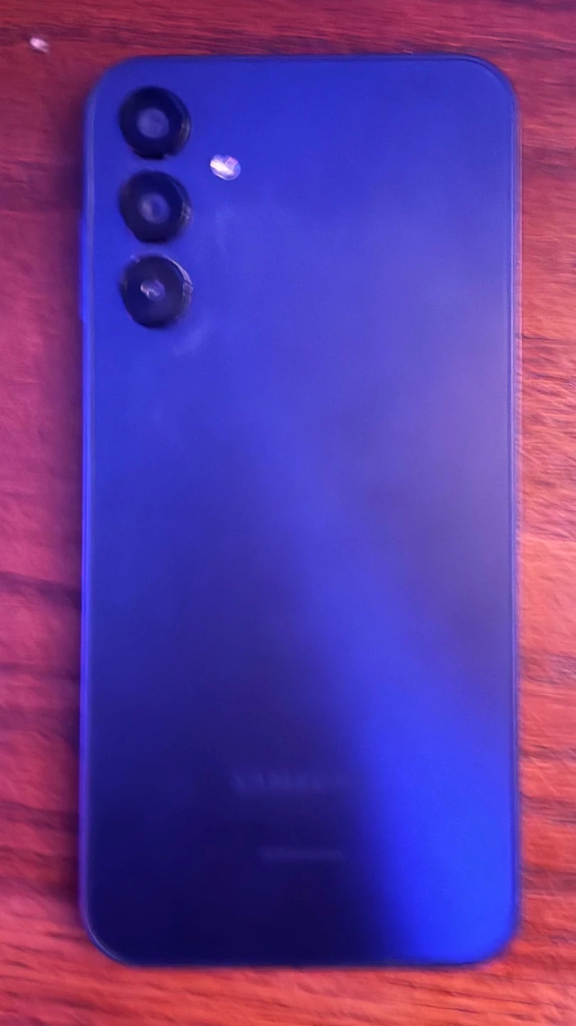 Samsung Galaxy A15 smartphone in black. It has 128 GB storage capacity. This phone is great for everyday use and capturing memories.