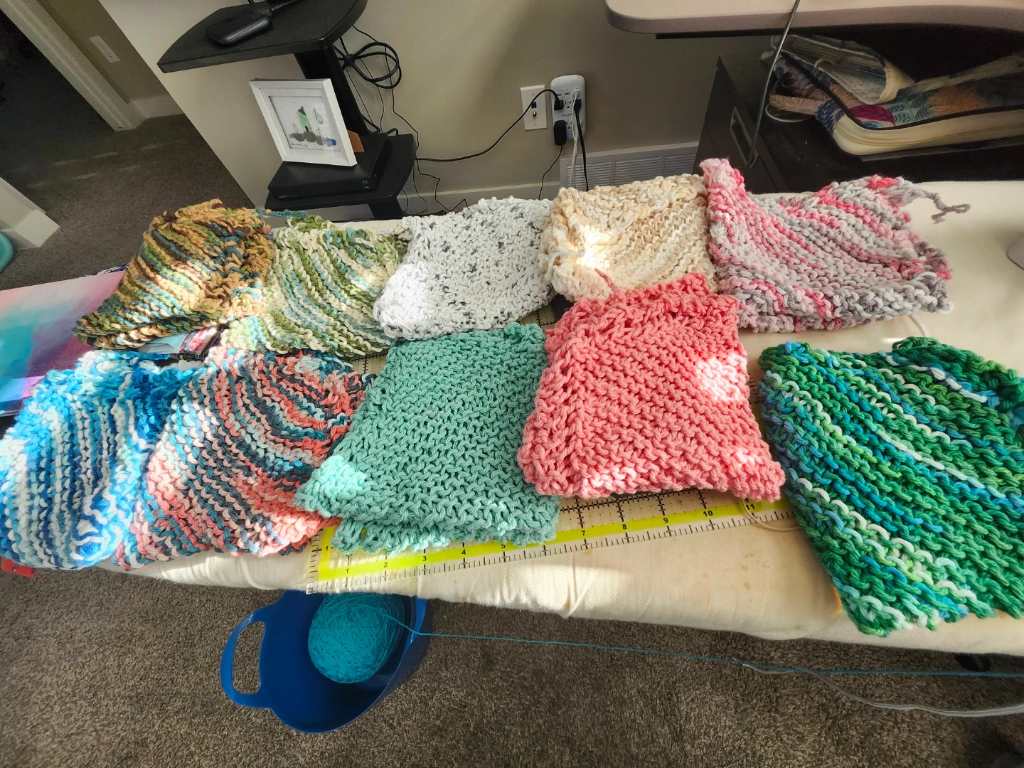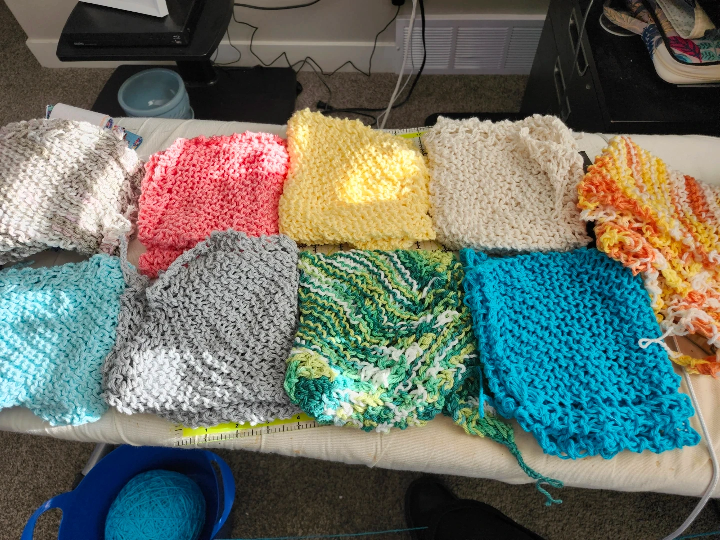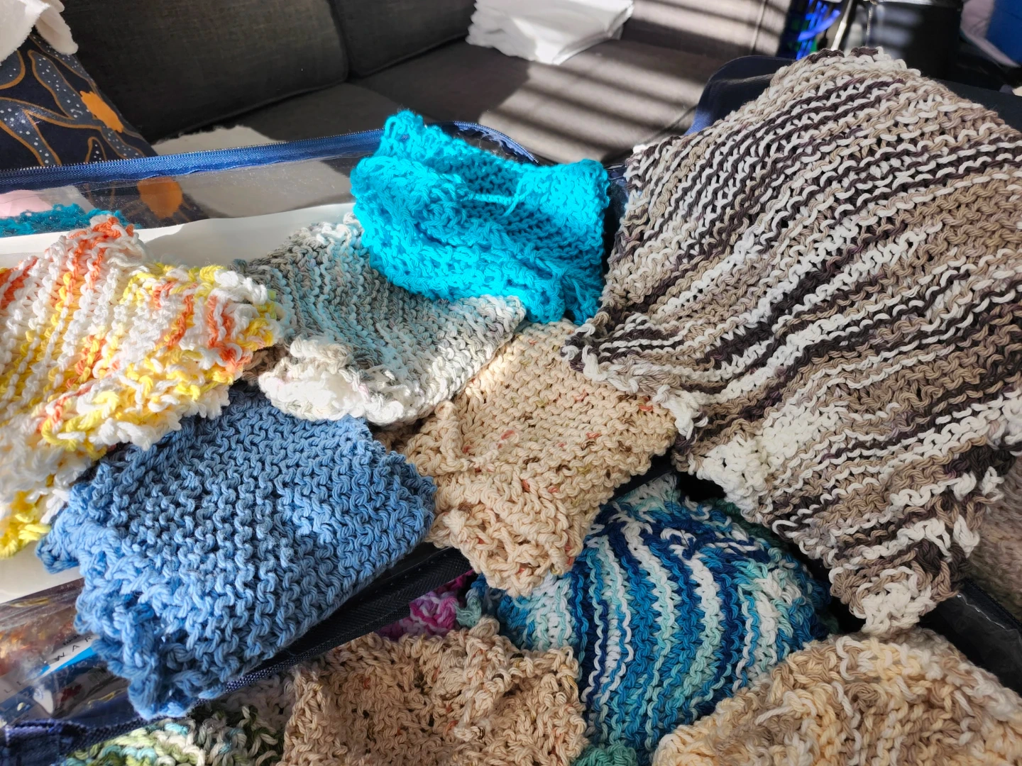 A collection of hand-knitted dishcloths in various colourful patterns. They're made from absorbent yarn, perfect for kitchen use. Each cloth is generously sized for everyday tasks. Pet and smoke free home