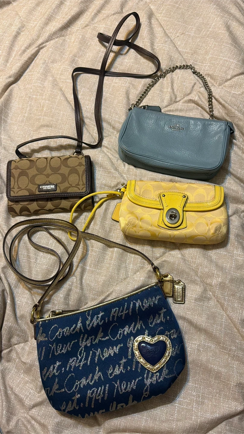 This is a bundle of three Coach wristlets and pouches. Includes a blue leather pouch, a yellow patterned pouch, and a brown patterned wallet/pouch. Each features Coach branding and unique designs.
