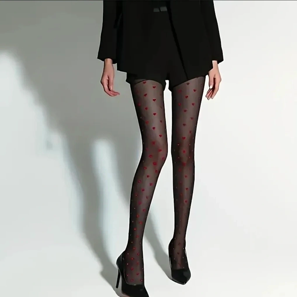 Sheer black tights featuring a pattern of small red hearts all over. These add a playful touch to any outfit. They're made of a stretchy, sheer material for comfort.