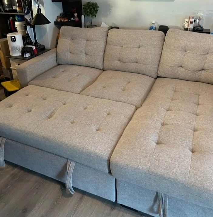 A light beige tufted sectional sofa with a chaise lounge. It features button tufting on the seat and back cushions. Hidden storage is accessible underneath the chaise and other sections. This sofa offers ample seating and convenient storage for your living space!