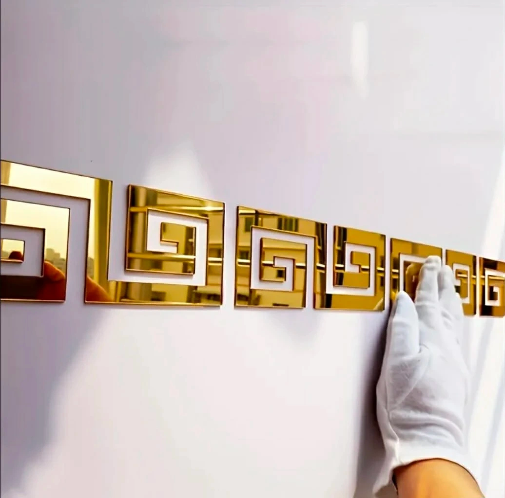 Add a touch of classic design to your walls with these gold-coloured mirror decals. Each decal is shaped like a Greek key pattern and measures approximately 5cm by 4.5cm. They have a protective film that needs to be removed before application. These decals are great for adding decorative accents to any room!