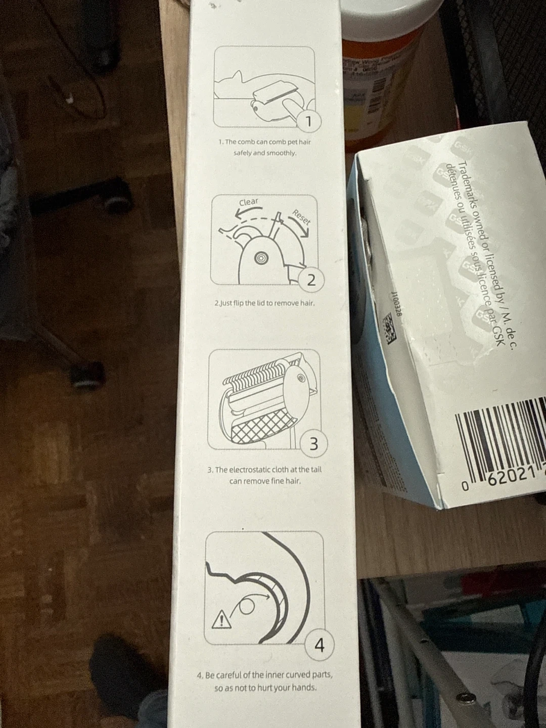 This is a pet grooming comb designed for effective hair removal. It features one-click hair removal for easy cleaning. The comb can comb pet hair safely and smoothly. A special electrostatic cloth at the tail helps remove fine hair.