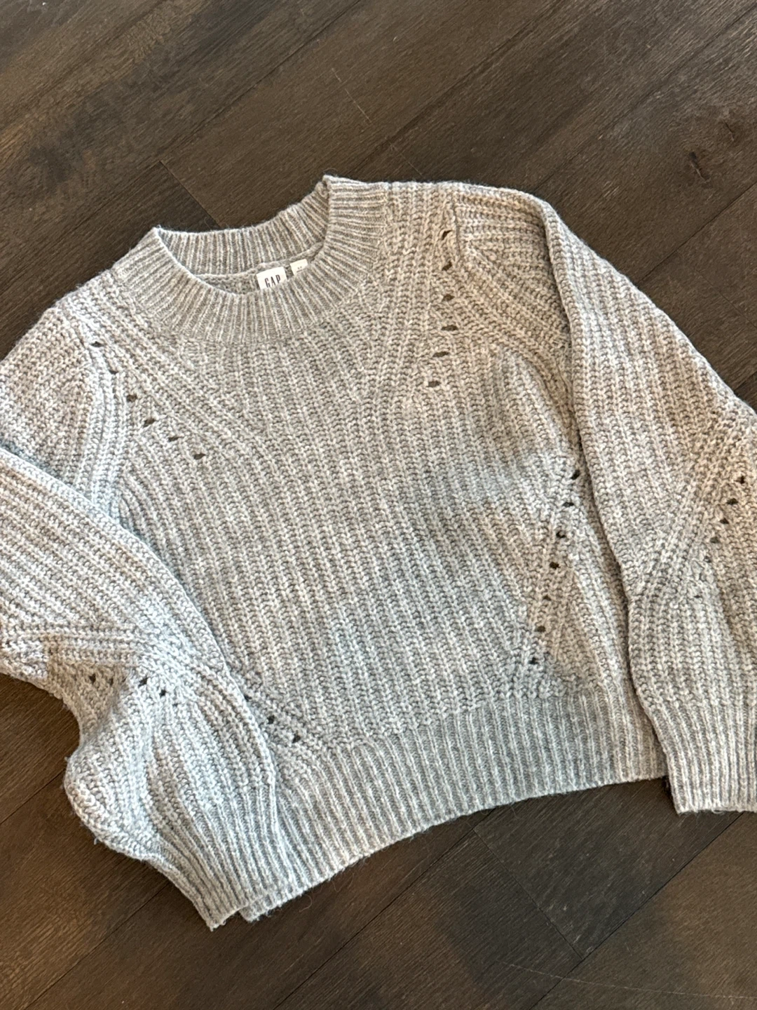 GAP grey knit sweater featuring a textured pattern and subtle cutout details on the sleeves and chest. It's a comfortable and stylish piece for cooler weather. Ribbed cuffs and hem. Wool blend
