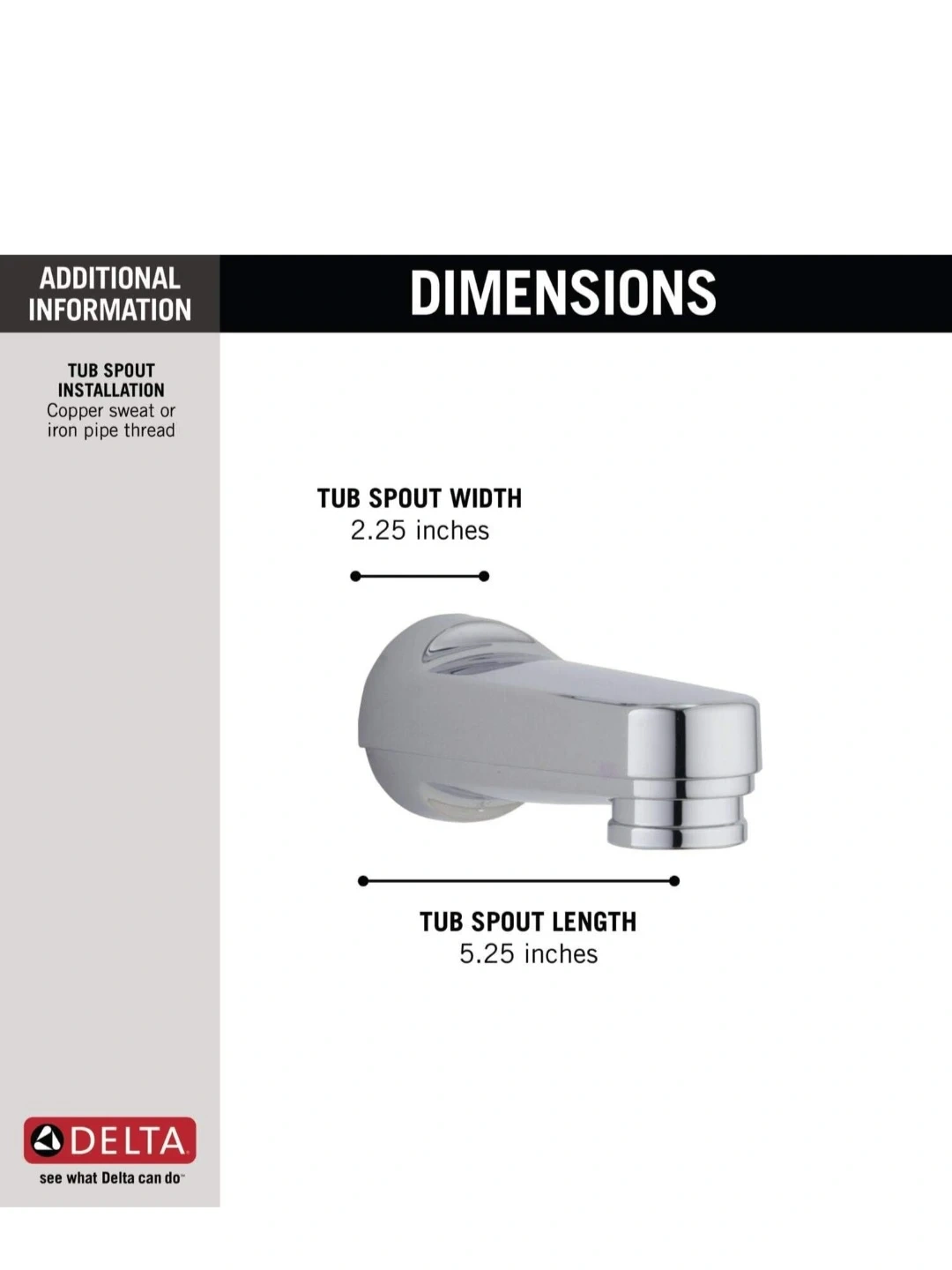 This is a Delta tub spout in a chrome finish. It's designed for copper sweat or iron pipe thread installation. The tub spout length is 5.25 inches and the width is 2.25 inches.