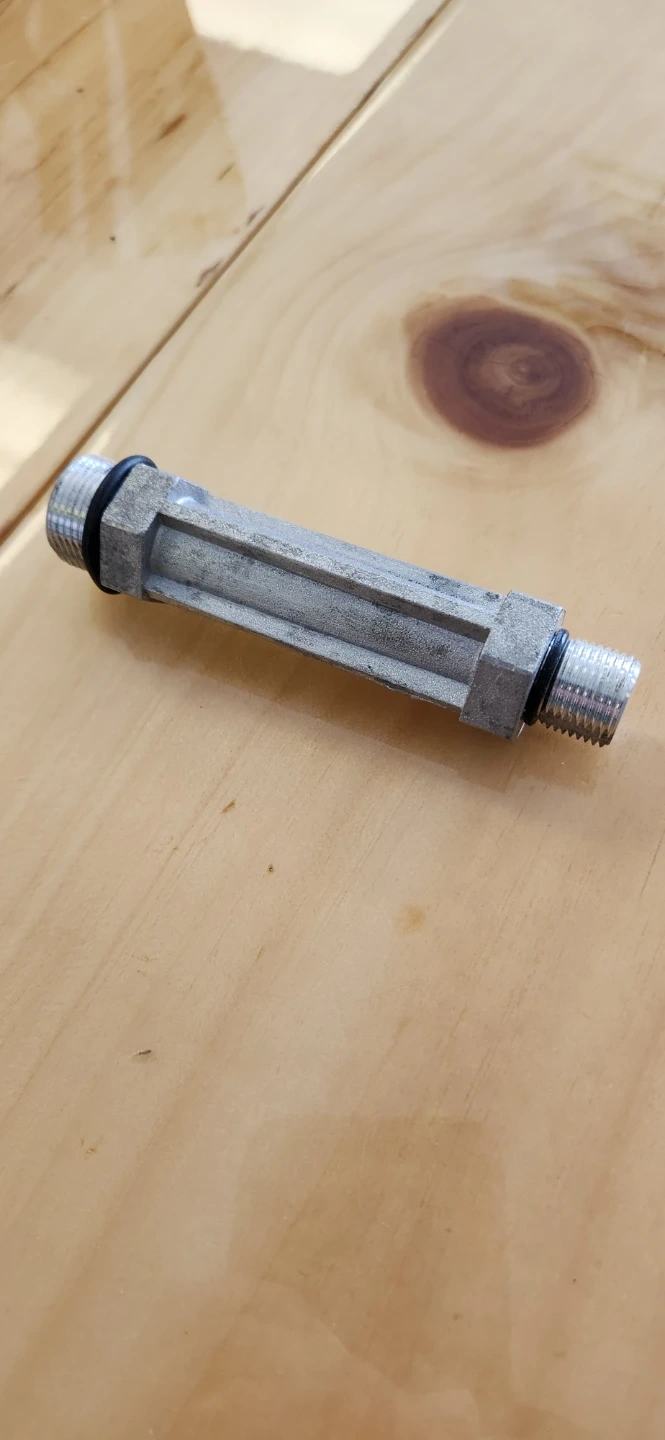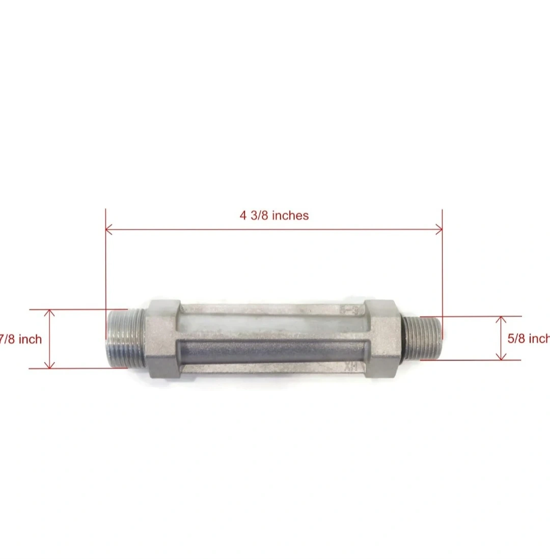 This inline water filter is made of aluminum. It measures 4 3/8 inches in length and 7/8 inches in diameter. The filter includes O-rings for a secure fit. This piece would be useful for someone looking to install a simple filtration system.