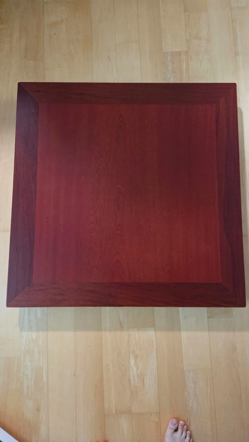 Solid wood coffee table in a dark cherry finish. It has a clean, modern design with a simple frame. Perfect for a living room or den.