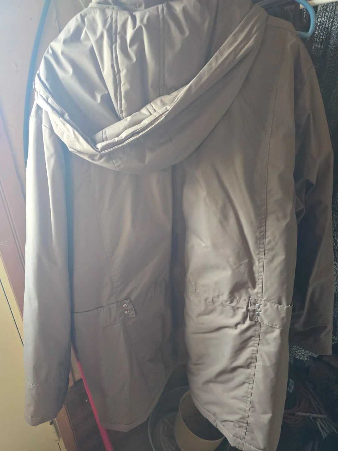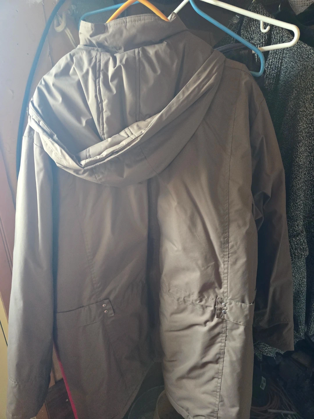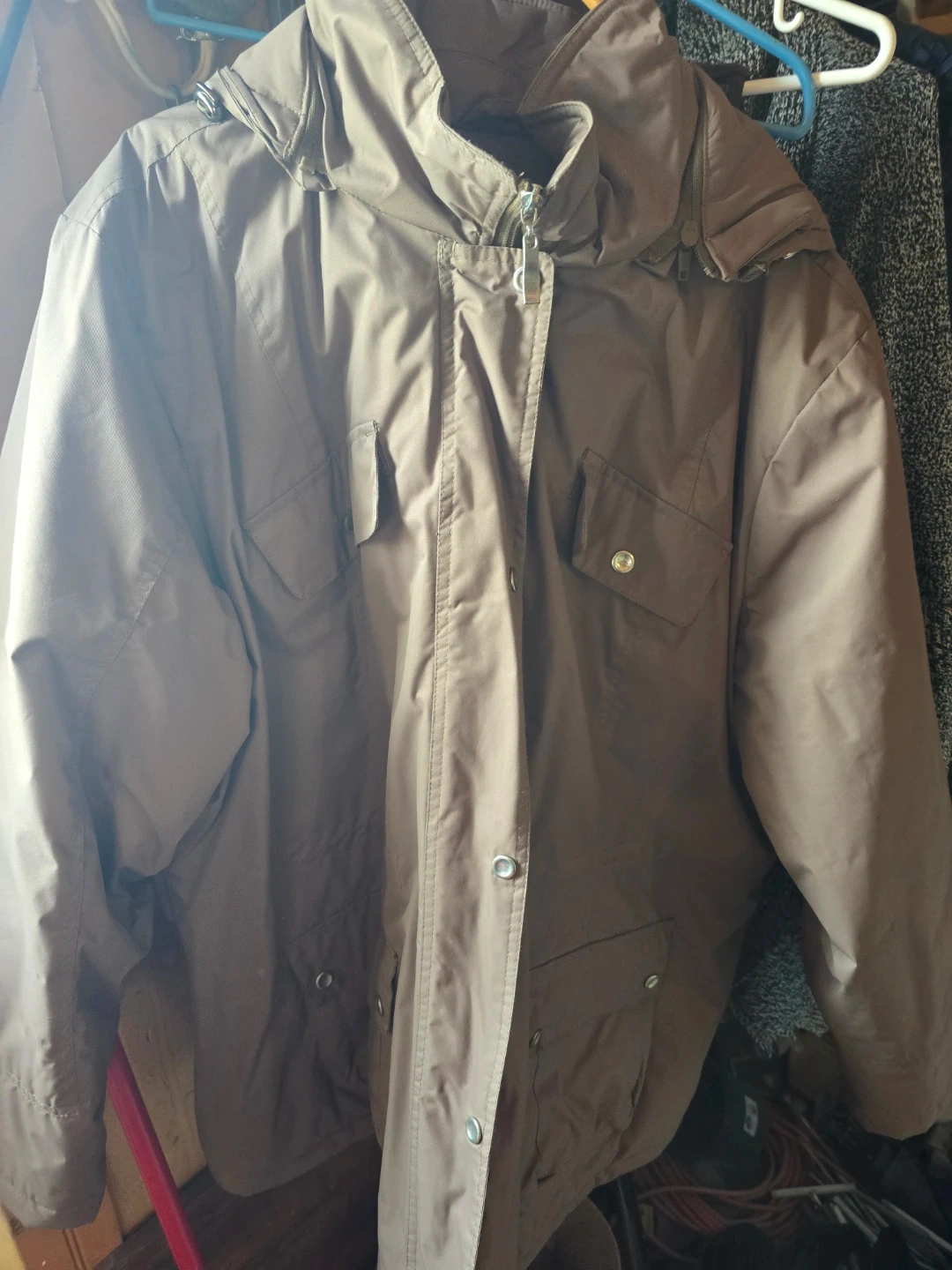 Warm brown winter jacket with a hood. It features multiple pockets with snap closures. This jacket is made from a durable, water-resistant material.