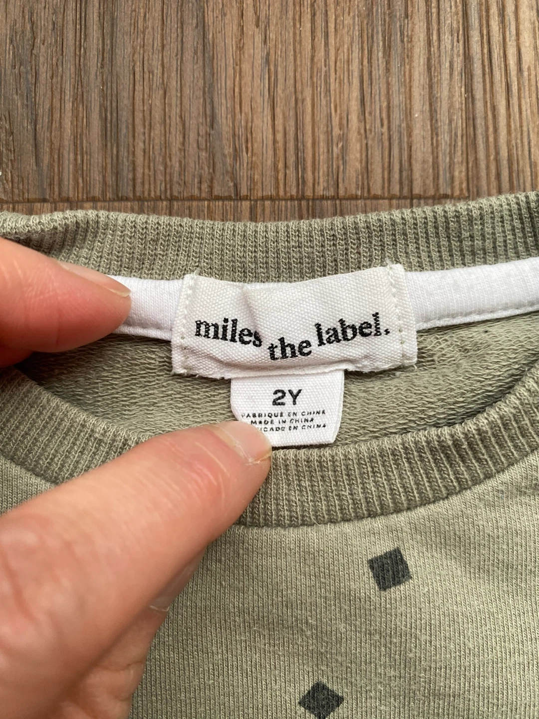 A cute Miles the Label crewneck sweatshirt for toddlers. It's a sage green colour with allover diamond pattern. Ribbed cuffs, collar, and hem. Organic cotton. Matching joggers available