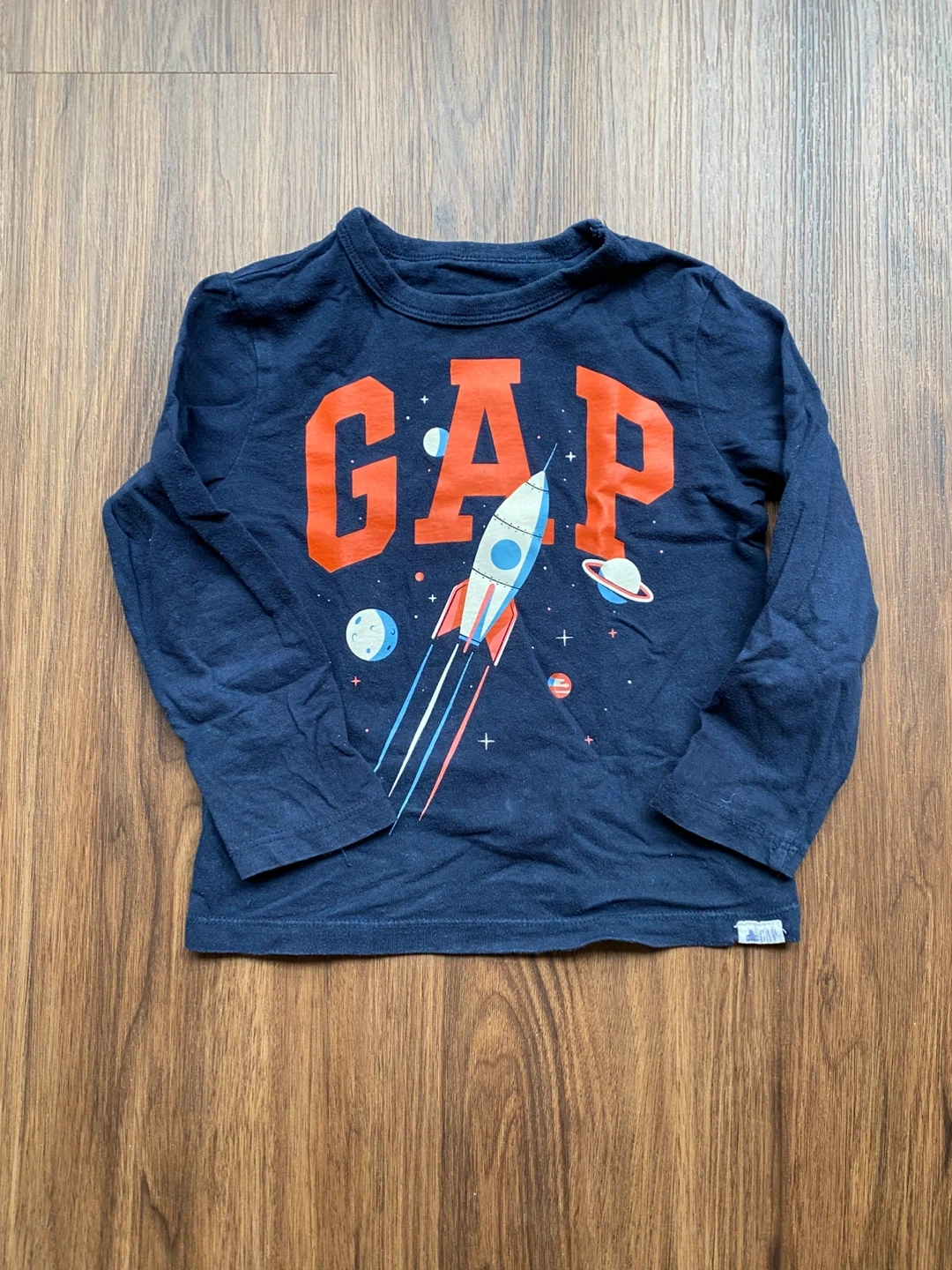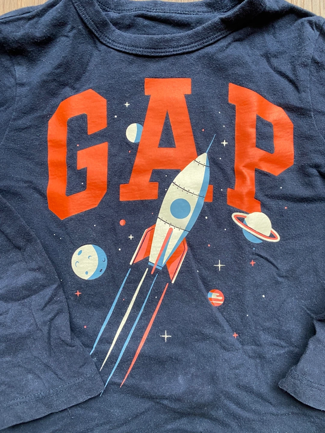 Navy blue long sleeve t-shirt from GAP featuring a fun rocket ship and space graphic. It's made of soft cotton and designed for toddlers. Perfect for little astronauts who love adventures in space!