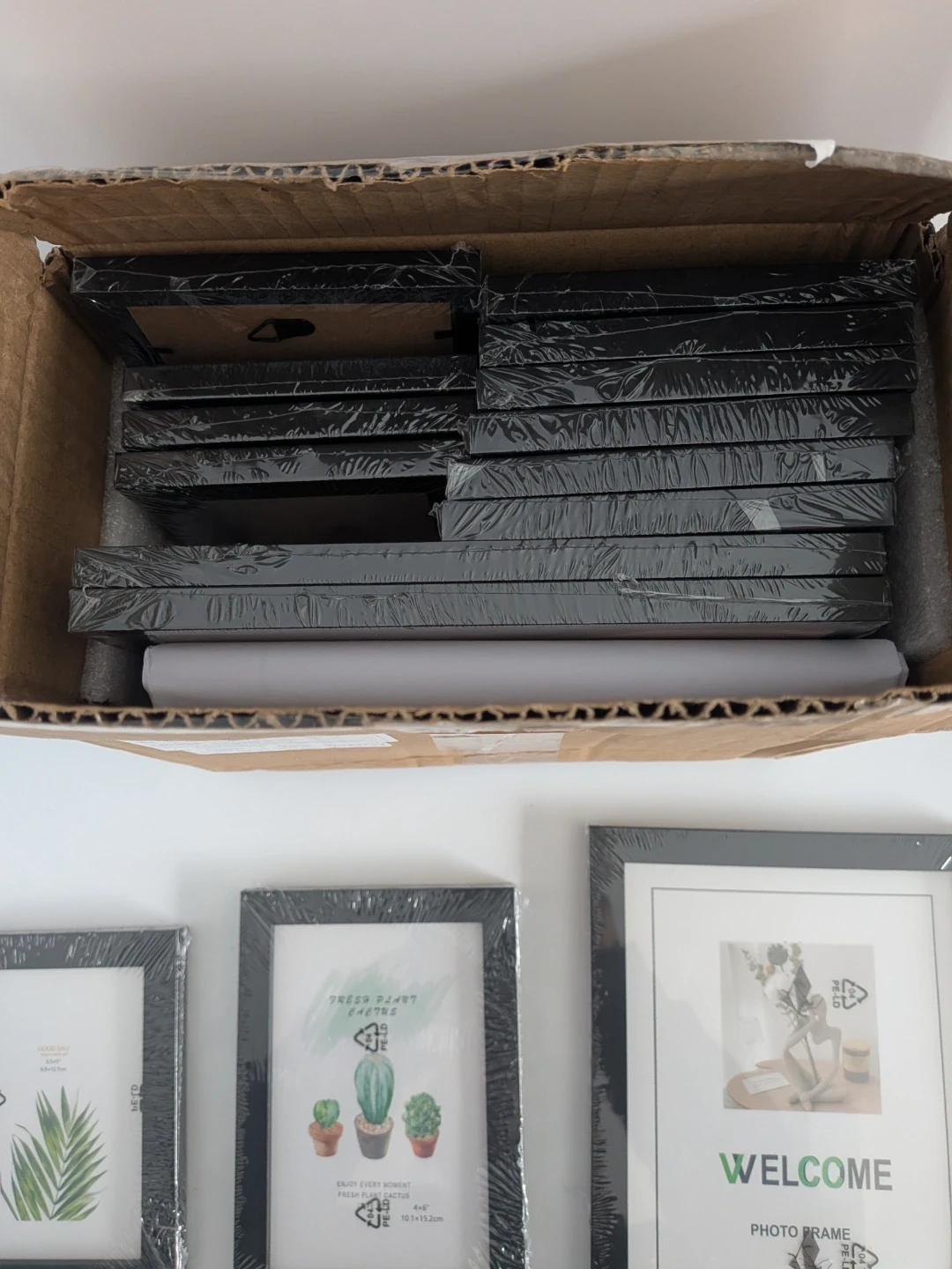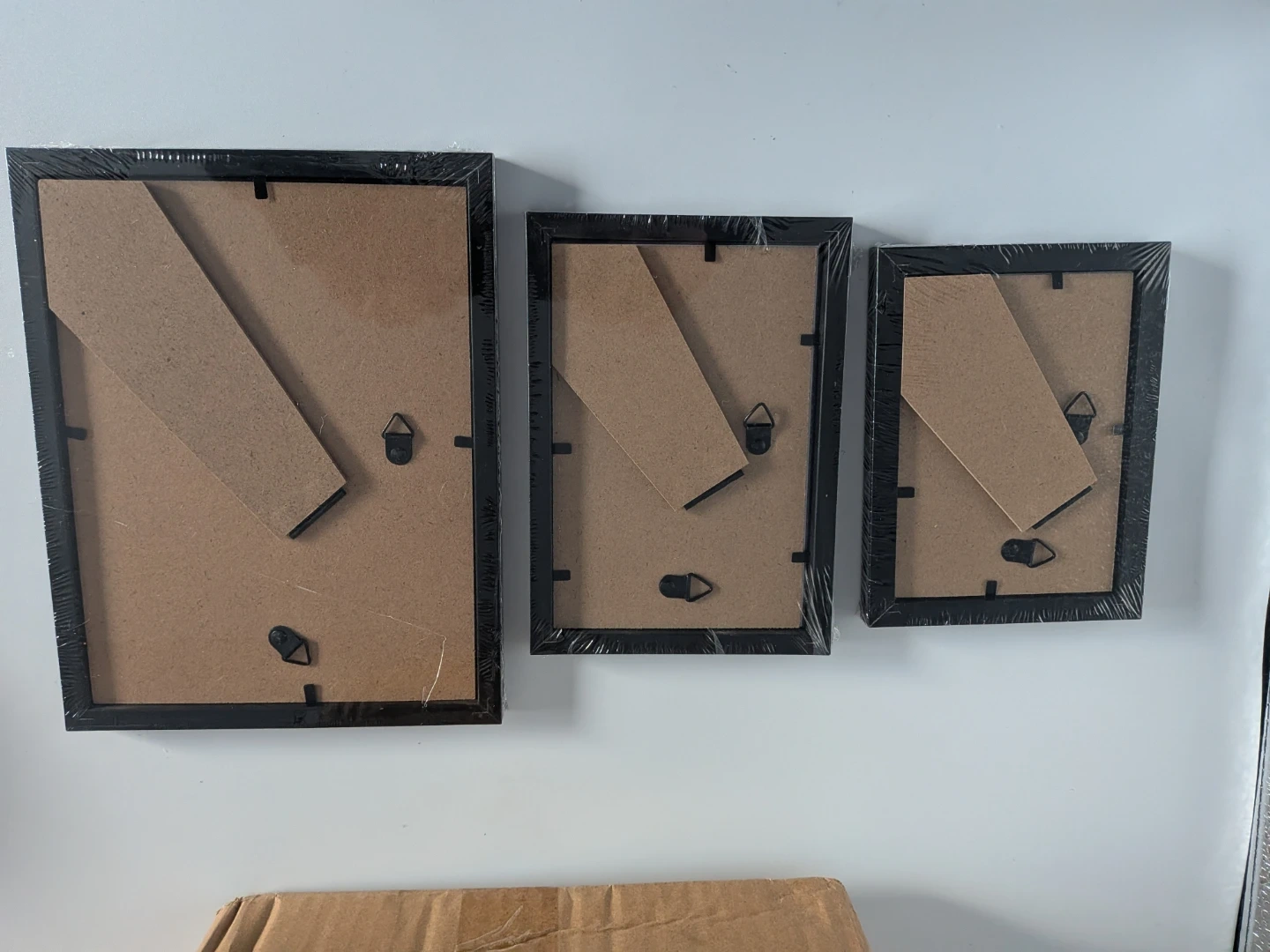 Set of 15 black photo frames. Includes 3 frames measuring 15x20cm (6x8 inches), 8 frames measuring 10x15cm (4x6 inches), and 4 frames measuring 9x13cm (3.5x5 inches). They're great for displaying your favourite memories!