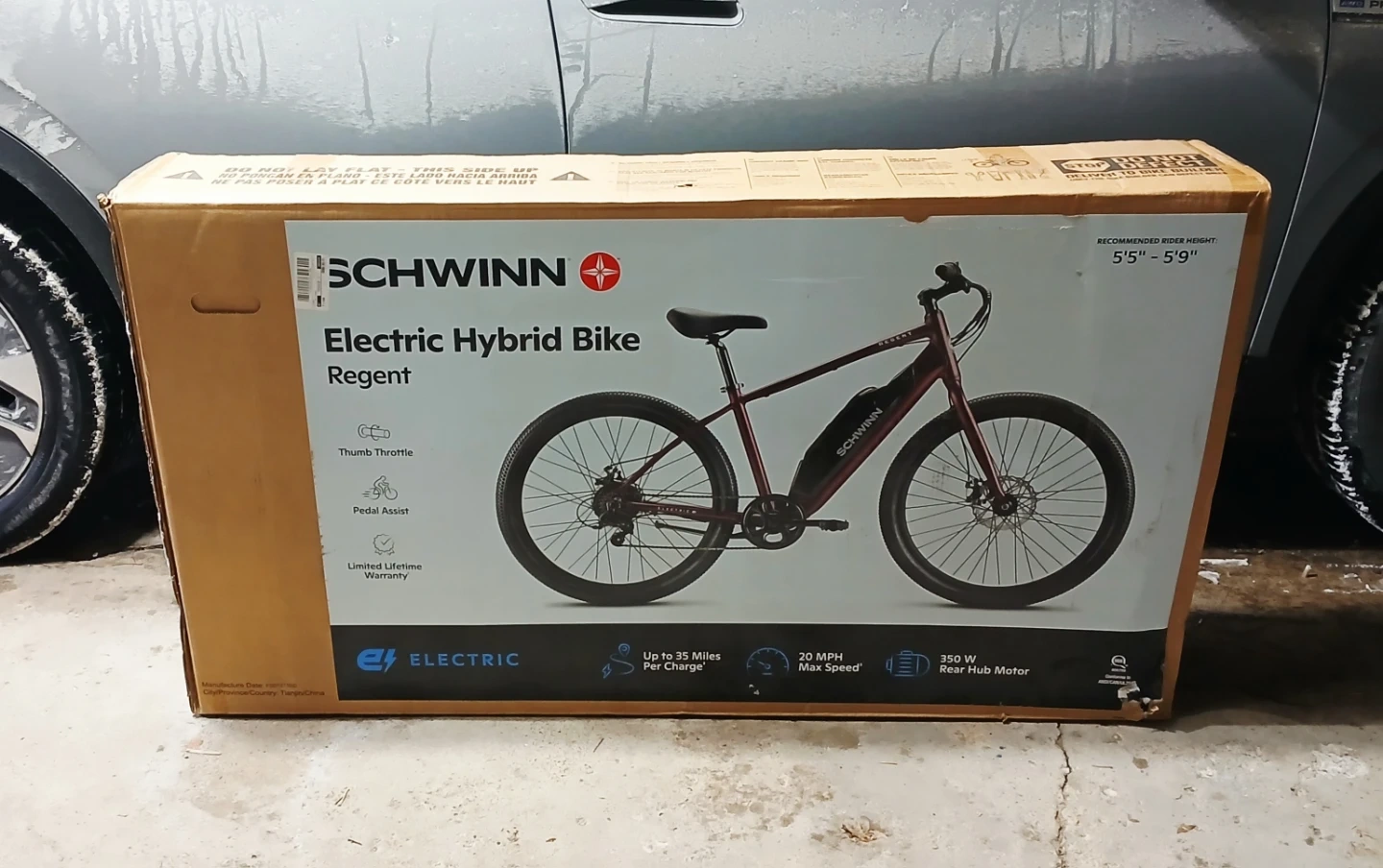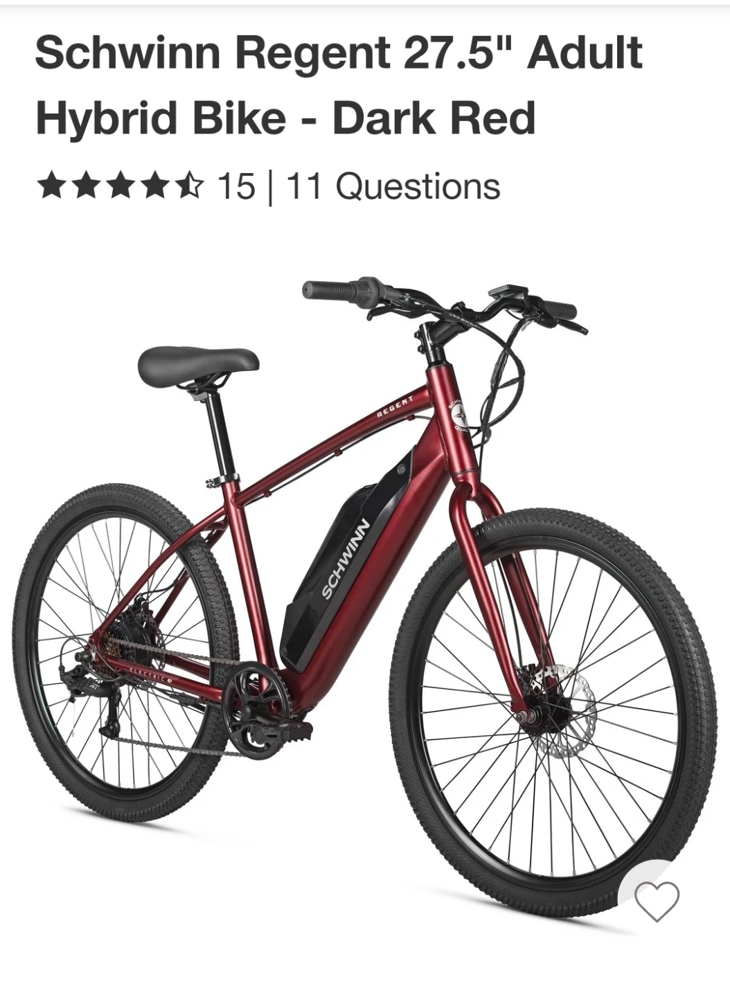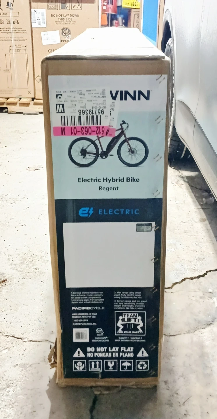 This is a new Schwinn Regent electric hybrid bike in dark red. Recommended rider height is 5'5" to 5'9".
