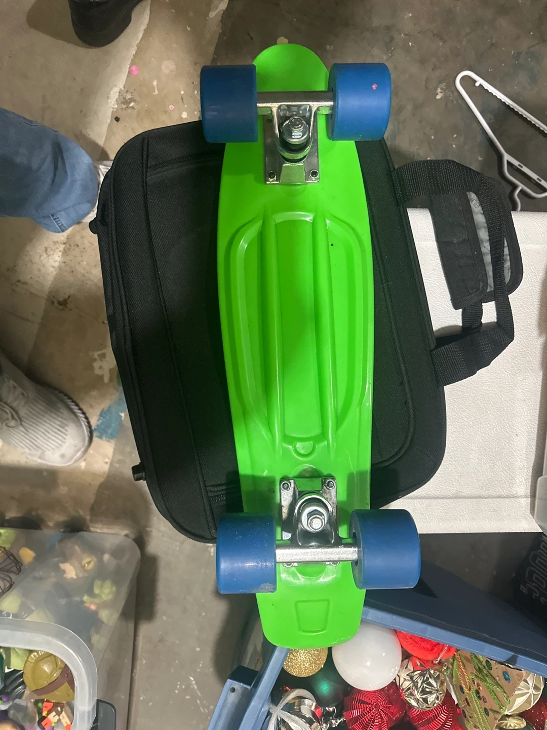 Bright green plastic deck skateboard with blue wheels. It's a fun size for cruising around. Perfect for quick trips or just for fun! Length is about 55cm. Wanted my kid to learn but he is not motivated so I just want to sell it, plus I’m cleaning the basement so I need to get rid of a few things.