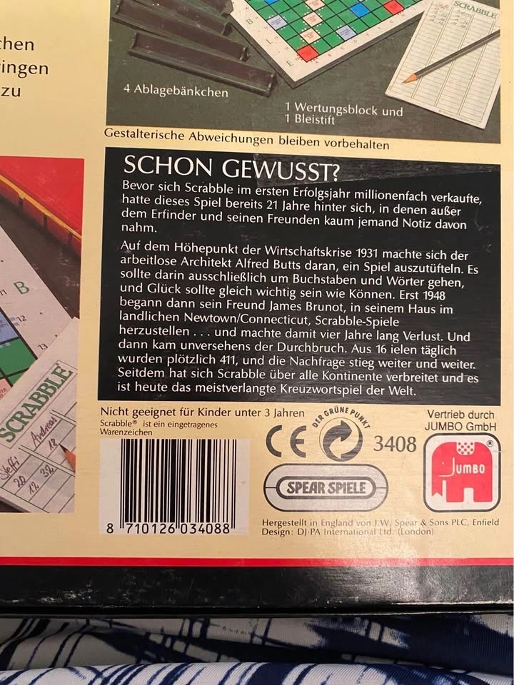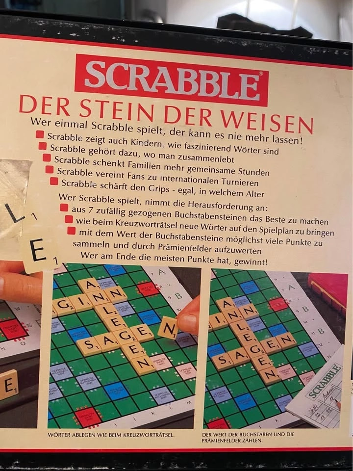 Buy & SellGerman Scrabble Vintage (1988)German Scrabble Vintage (1988)$25This is a complete game with all the tiles, instructions, and some score sheets. It comes from a smoke-free home. Pick up in Airdrie.WHERE TO MEETCheck LocationView MapSELLERLoreleeWoodside50 reviews0 chats·0 favorites·0 viewsSEND CHAT TO SELLERHi Lorelee! I’m interested in your listing.Hi Lorelee! I’m interested in your listing.Get the Karrot app to chatSign In to chat