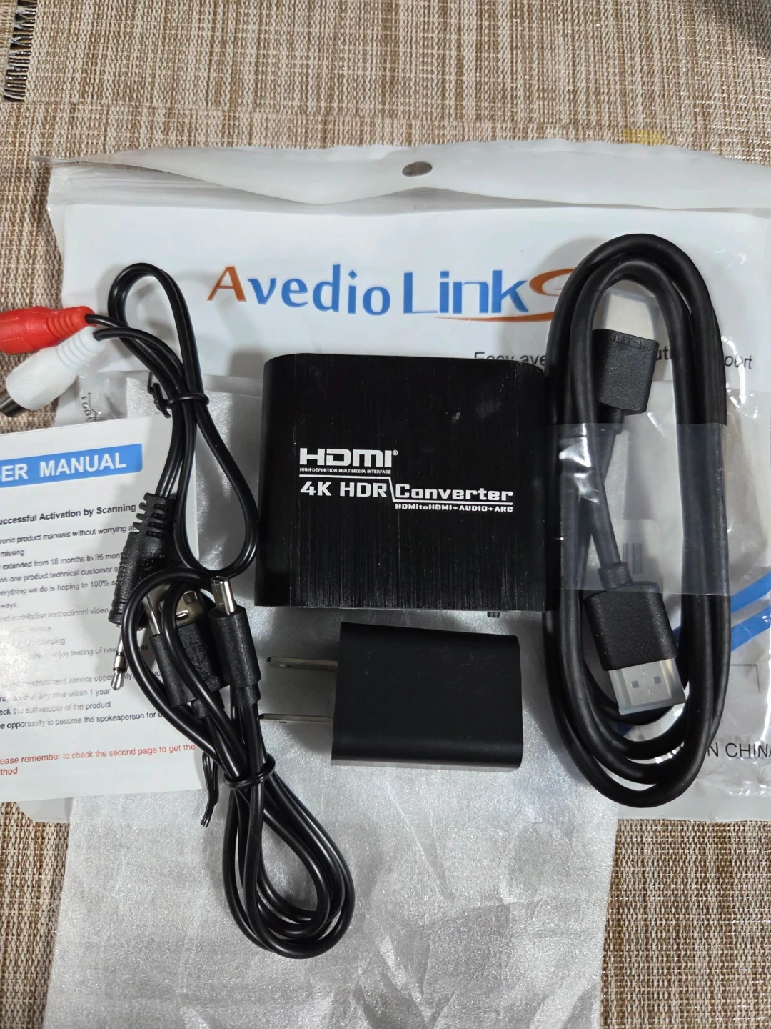 This is an Avedio Link 4K HDR HDMI converter. It supports HDMI to HDMI audio and ARC. It includes the converter box, HDMI cable, RCA cables, and a power adapter.