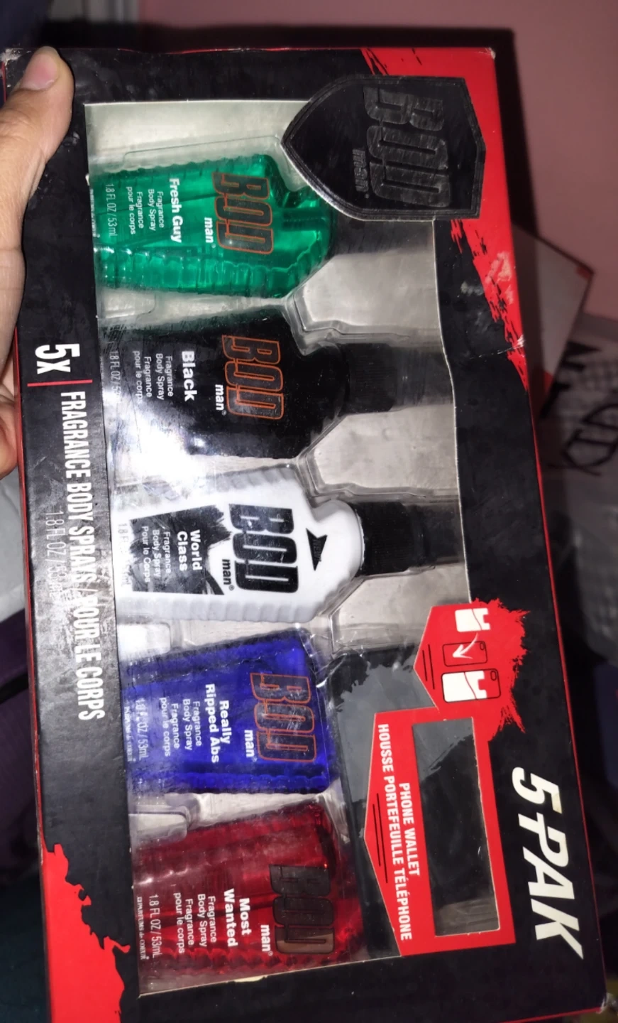 This 5-pack from BOD Man includes five different fragrance body sprays. Each spray is 1.8 fl oz or 53ml. Scents are Fresh Guy, Black, World Class, Really Ripped Abs.