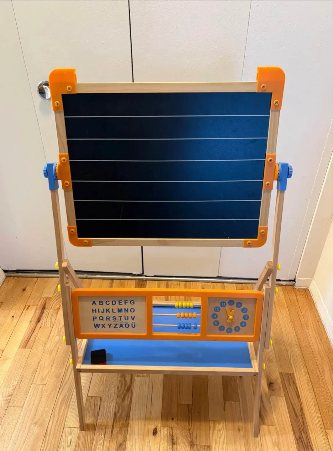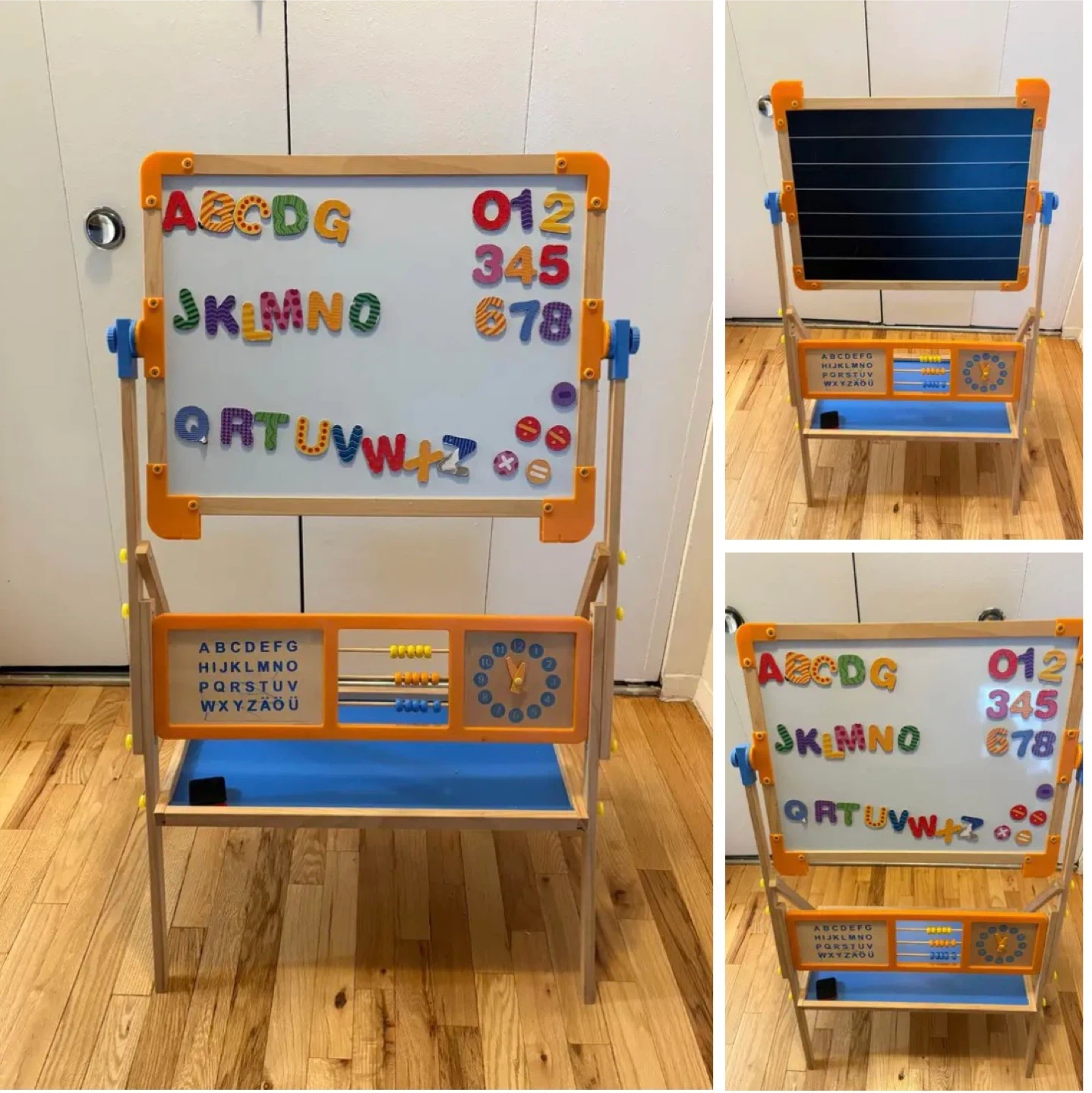 Easel holding a reversible magnetic whiteboard (stick on magnetic letters or numbers, and write with markers) and a blackboard (chalk)