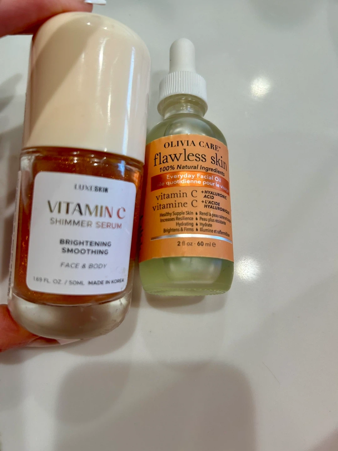 Luxe Skin Vitamin C Shimmer Serum for face and body, 50ml. Olivia Care Flawless Skin Everyday Facial Oil with Vitamin C and Hyaluronic Acid, 60ml. Both are designed for brightening and smoothing. Selling together only for 10 to spread kindness