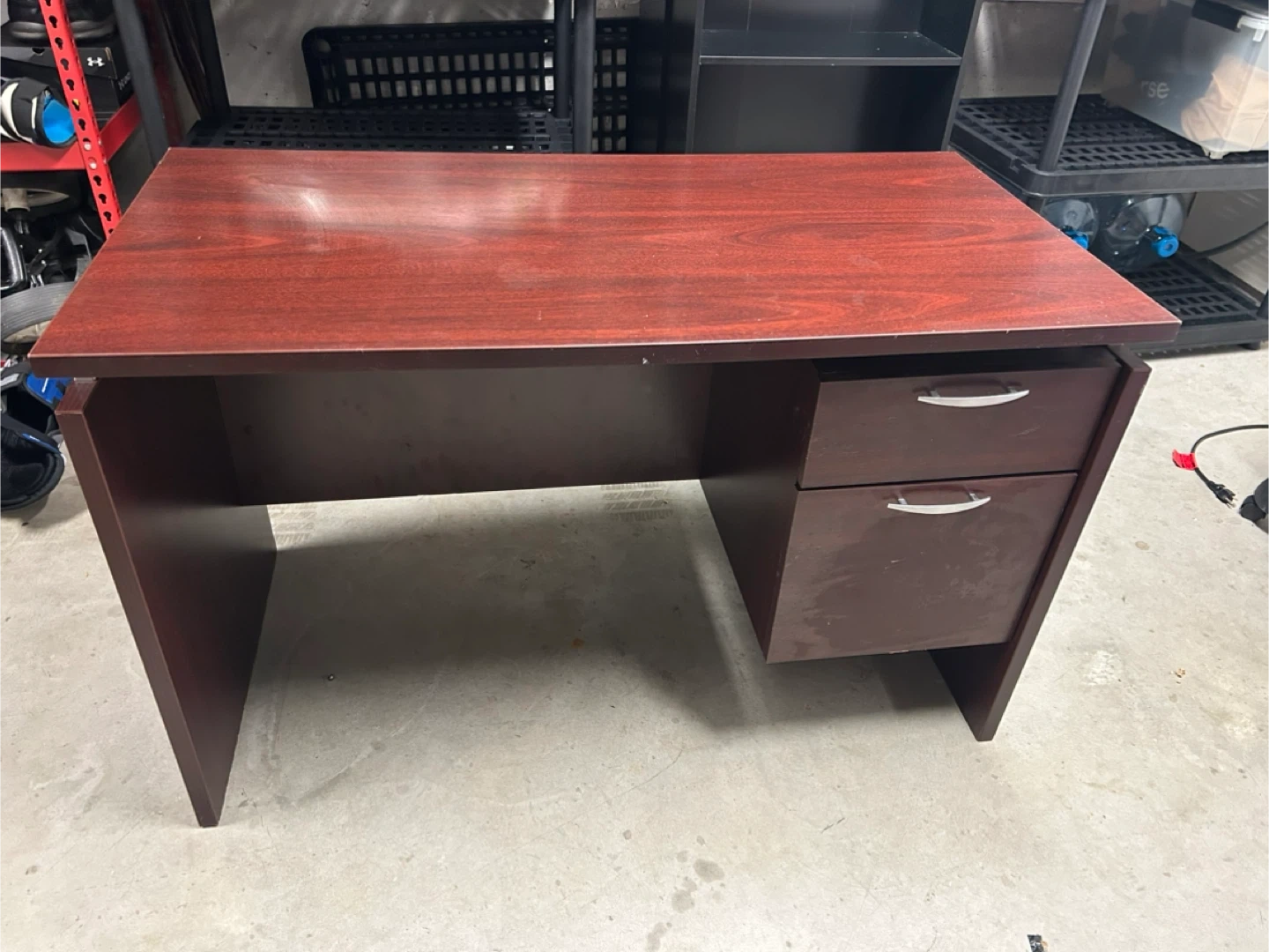 This desk features a rich brown wood finish and two convenient drawers for storage. It's a practical addition for any home office or study space. Made of wood.