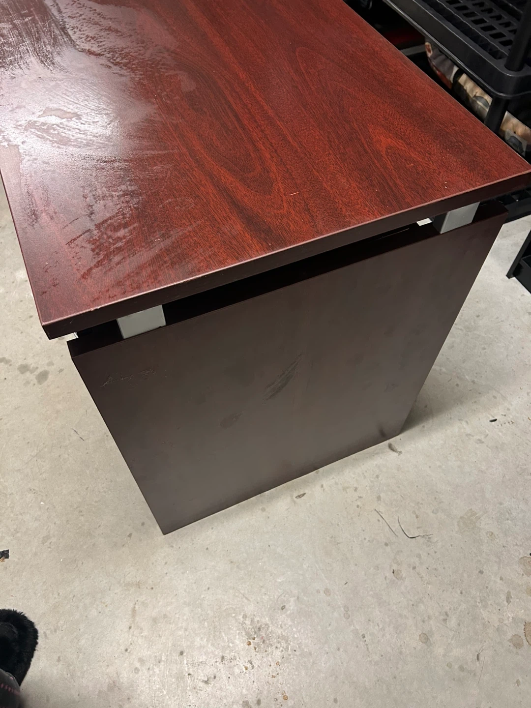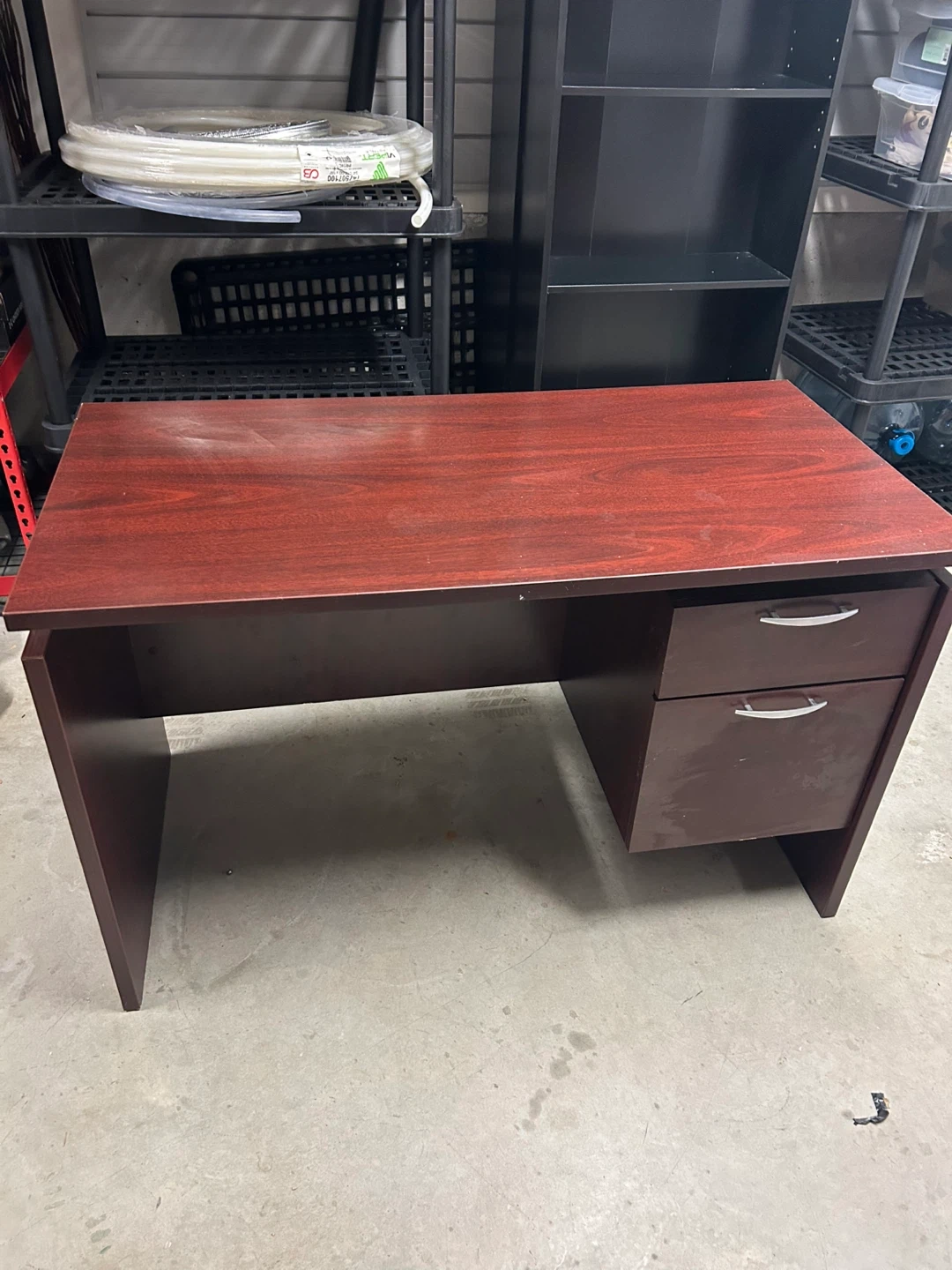 This desk features a rich brown wood finish and two convenient drawers for storage. It's a practical addition for any home office or study space. Made of wood.