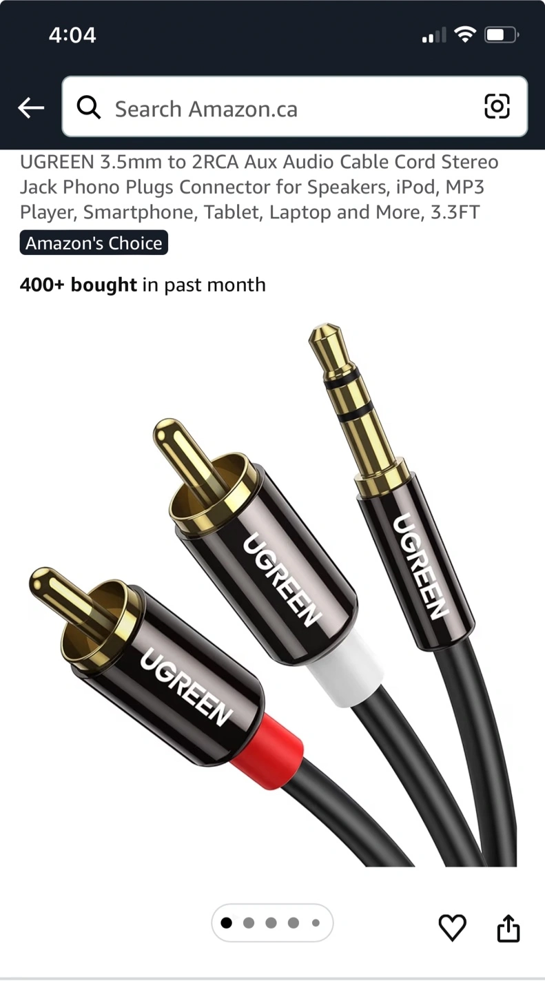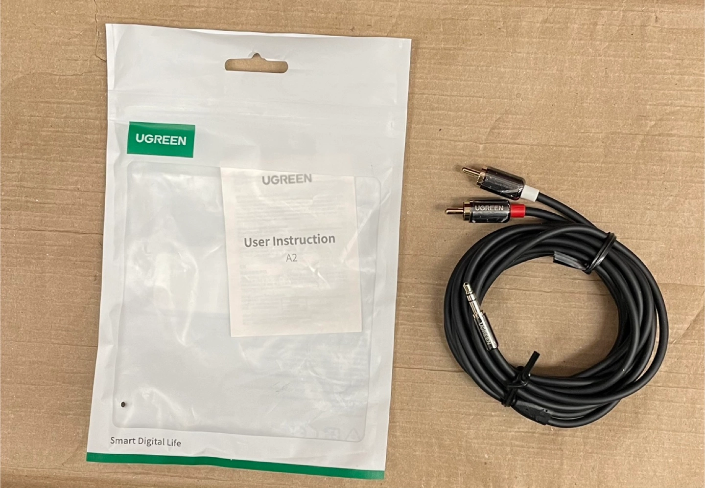 UGREEN 3.5mm to 2RCA stereo audio aux cable. Connects your phone, MP3 player, or tablet to your speakers or home stereo. 3.3FT length.