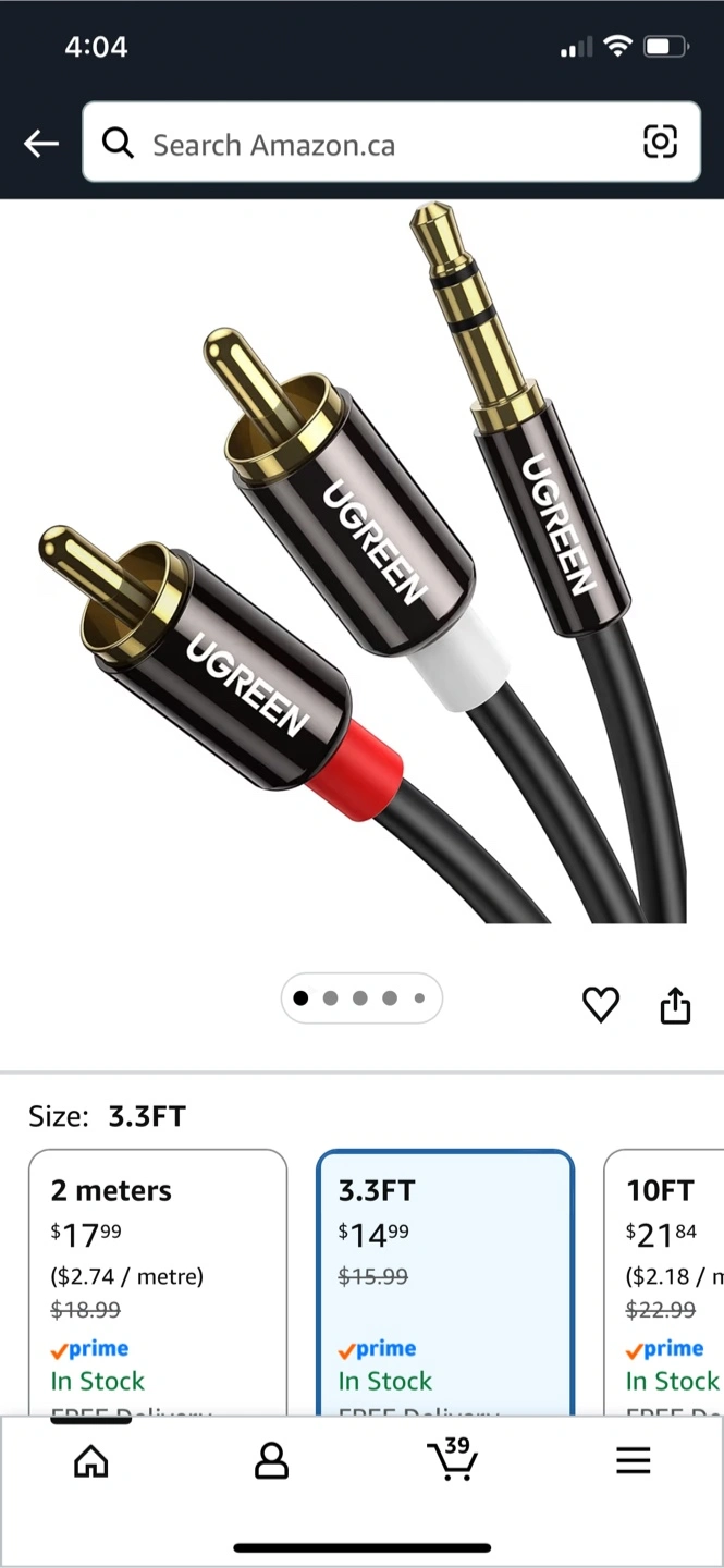 UGREEN 3.5mm to 2RCA stereo audio aux cable. Connects your phone, MP3 player, or tablet to your speakers or home stereo. 3.3FT length.