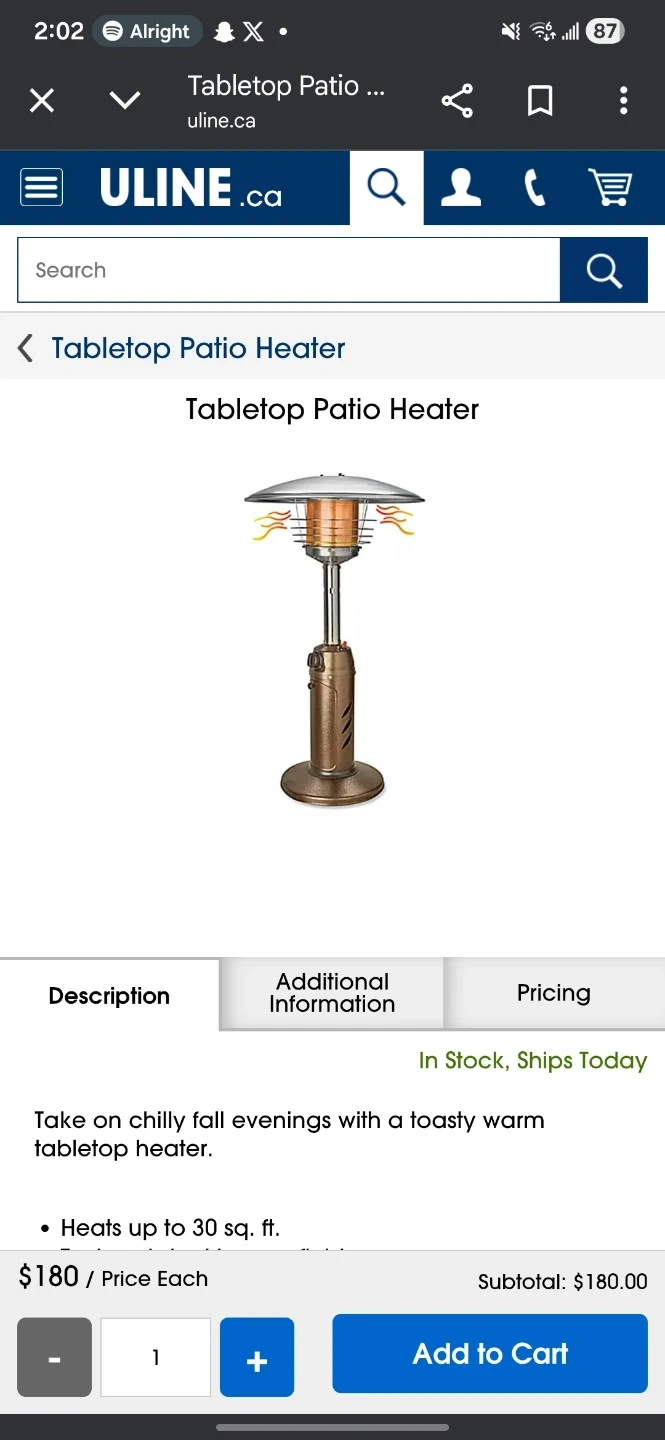 Buy & SellTabletop Patio Heater - ULINE H-5221Tabletop Patio Heater - ULINE H-5221$90New tabletop patio heater. Heats up to 30 sq. ft. It's perfect for adding warmth to outdoor spaces on cooler evenings.ConditionNewWHERE TO MEET2117 Ninth AveView MapSELLERverifiedClintonConnaught Heights761 review2 chats·1 favorites·39 viewsSEND CHAT TO SELLERHi Clinton! I’m interested in your listing.Hi Clinton! I’m interested in your listing.Get the Karrot app to chatSign In to chat