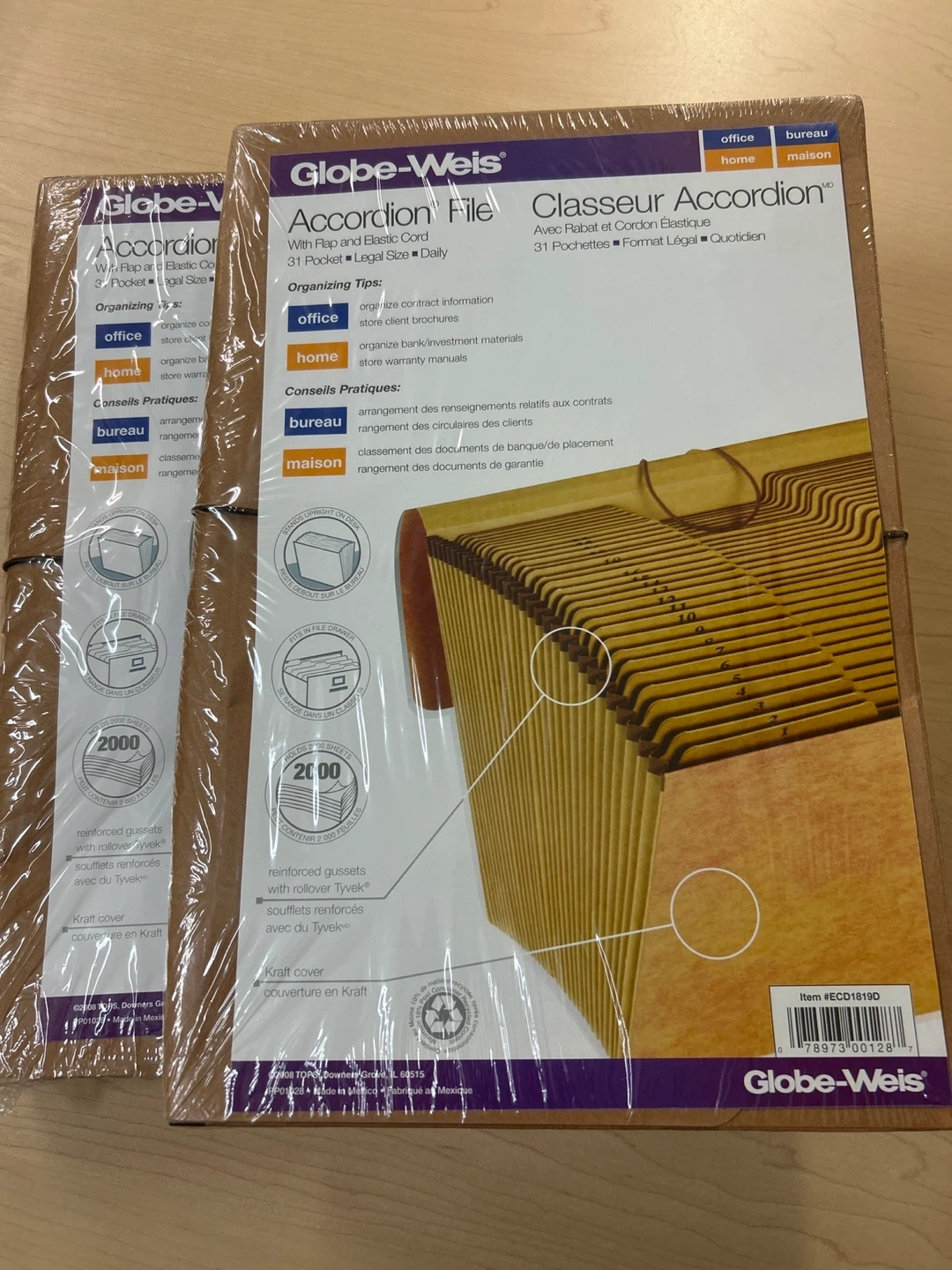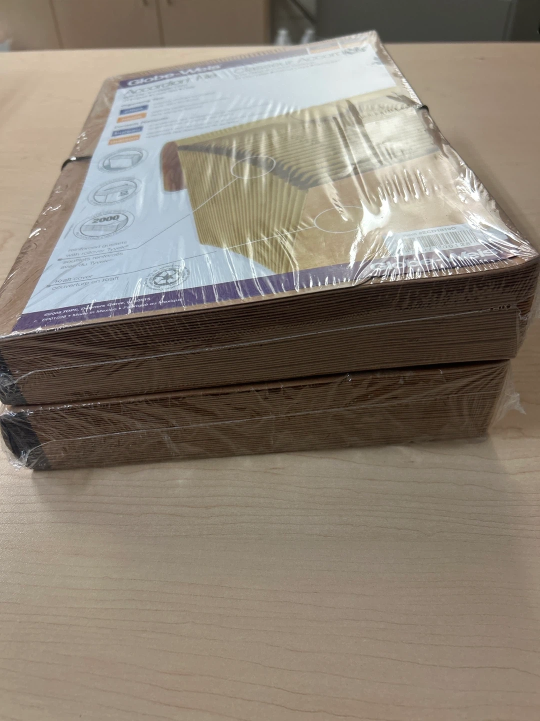 Globe-Weis Accordion File with flap and elastic cord. It's legal size and holds 2000 sheets. Reinforced gussets with rollover Tyvek. π