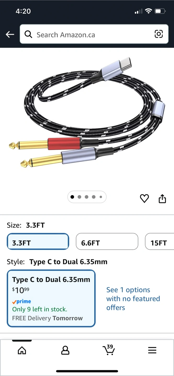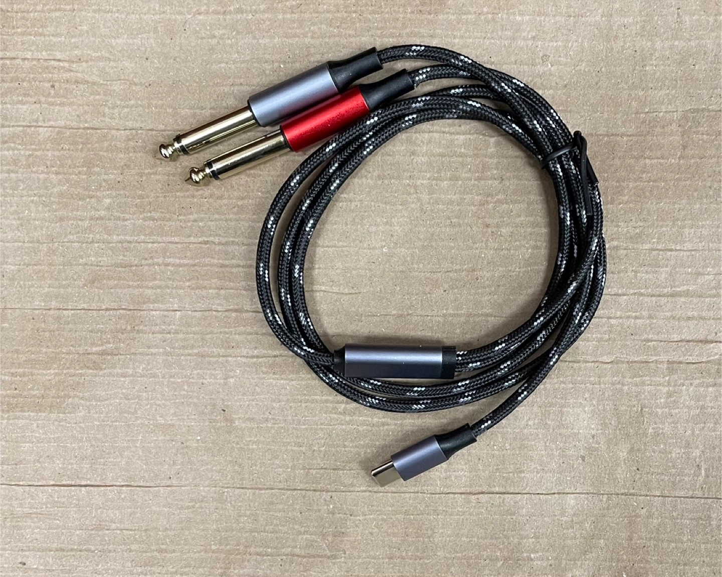 This cable is a Type C to Dual 6.35mm audio cable. It's 3.3 feet long and suitable for connecting devices like smartphones and tablets to audio equipment. The cable features a braided design for durability.