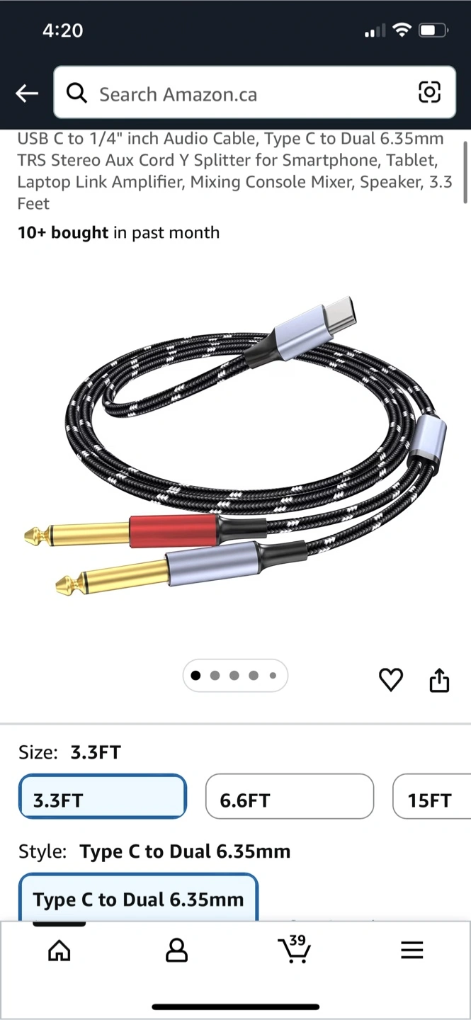 This cable is a Type C to Dual 6.35mm audio cable. It's 3.3 feet long and suitable for connecting devices like smartphones and tablets to audio equipment. The cable features a braided design for durability.
